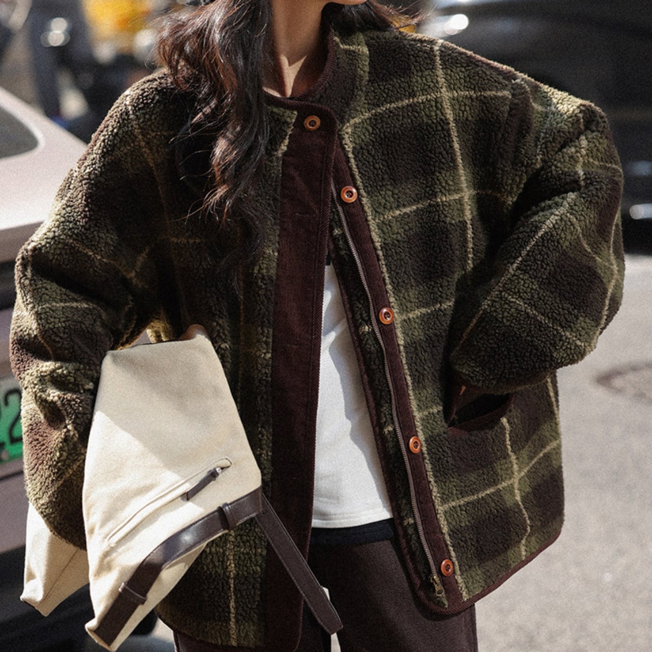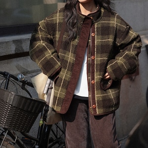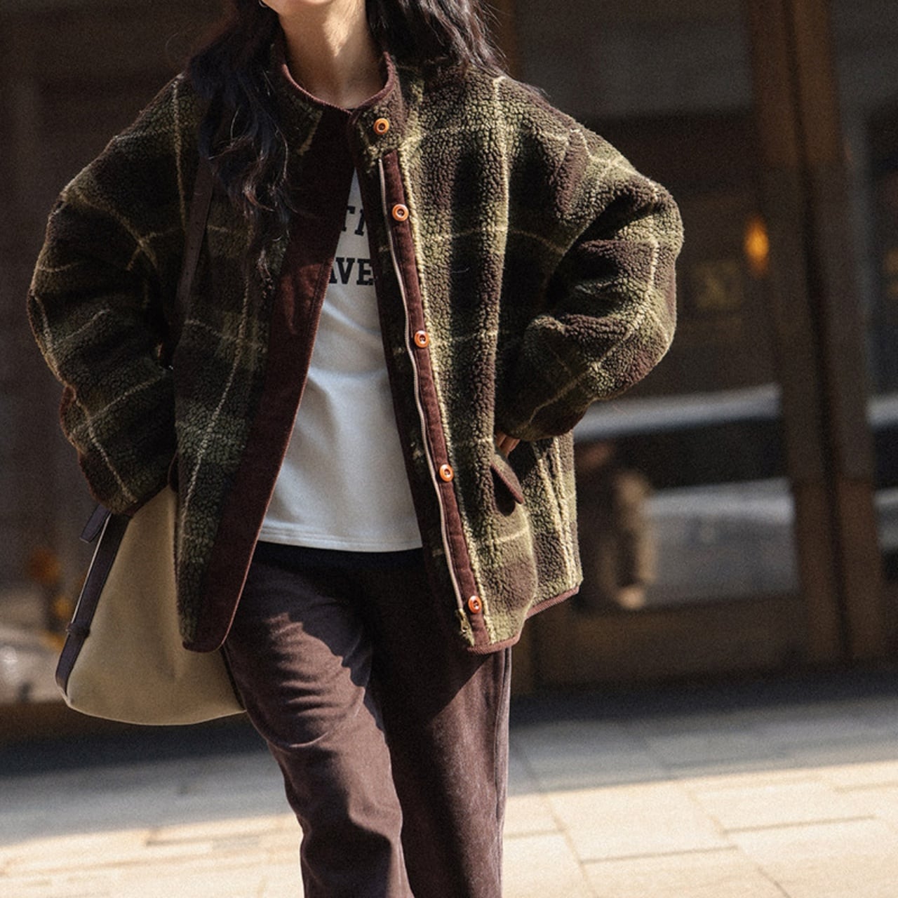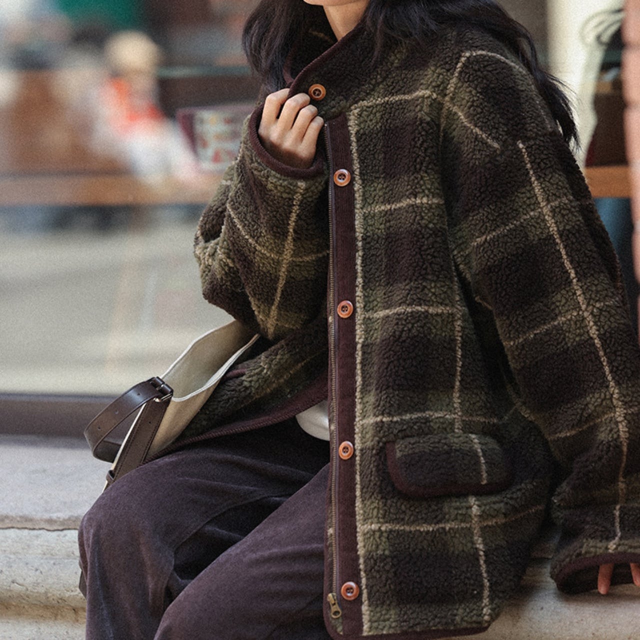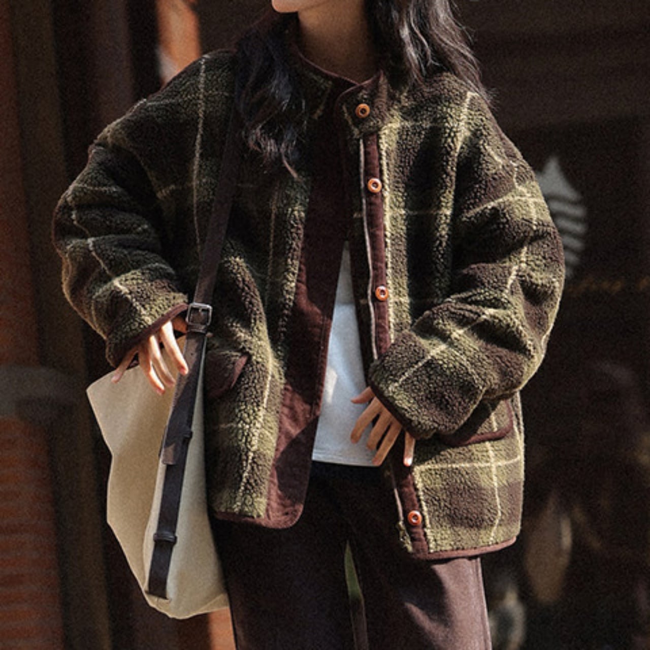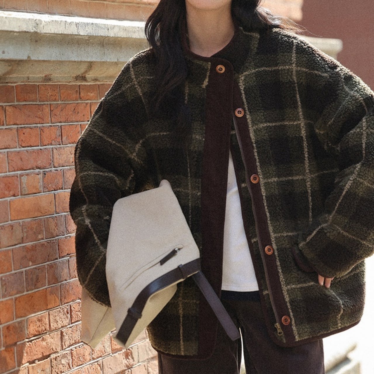 深みのあるグリーンの大柄チェックが、冬の装いにクラシカルな温かみを添えます。