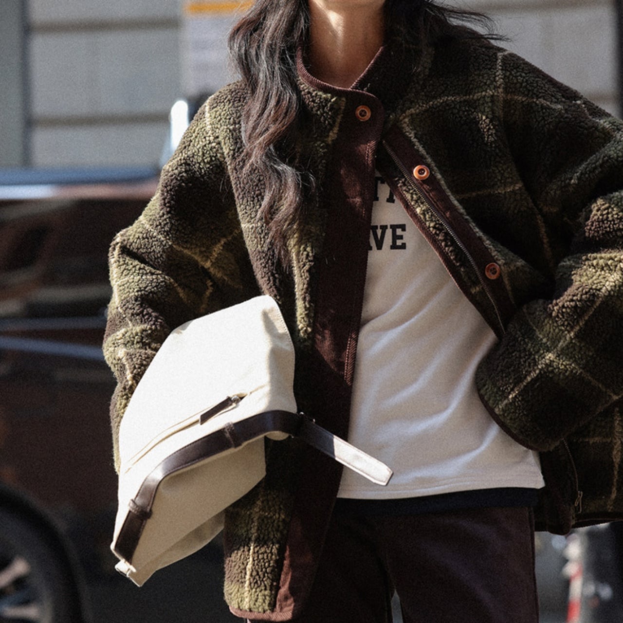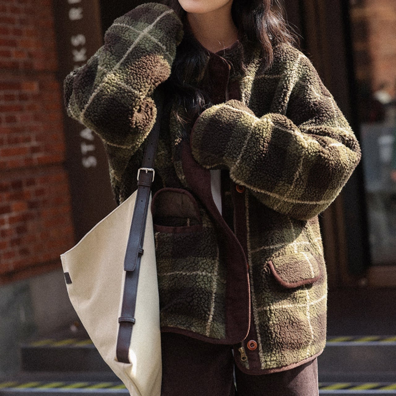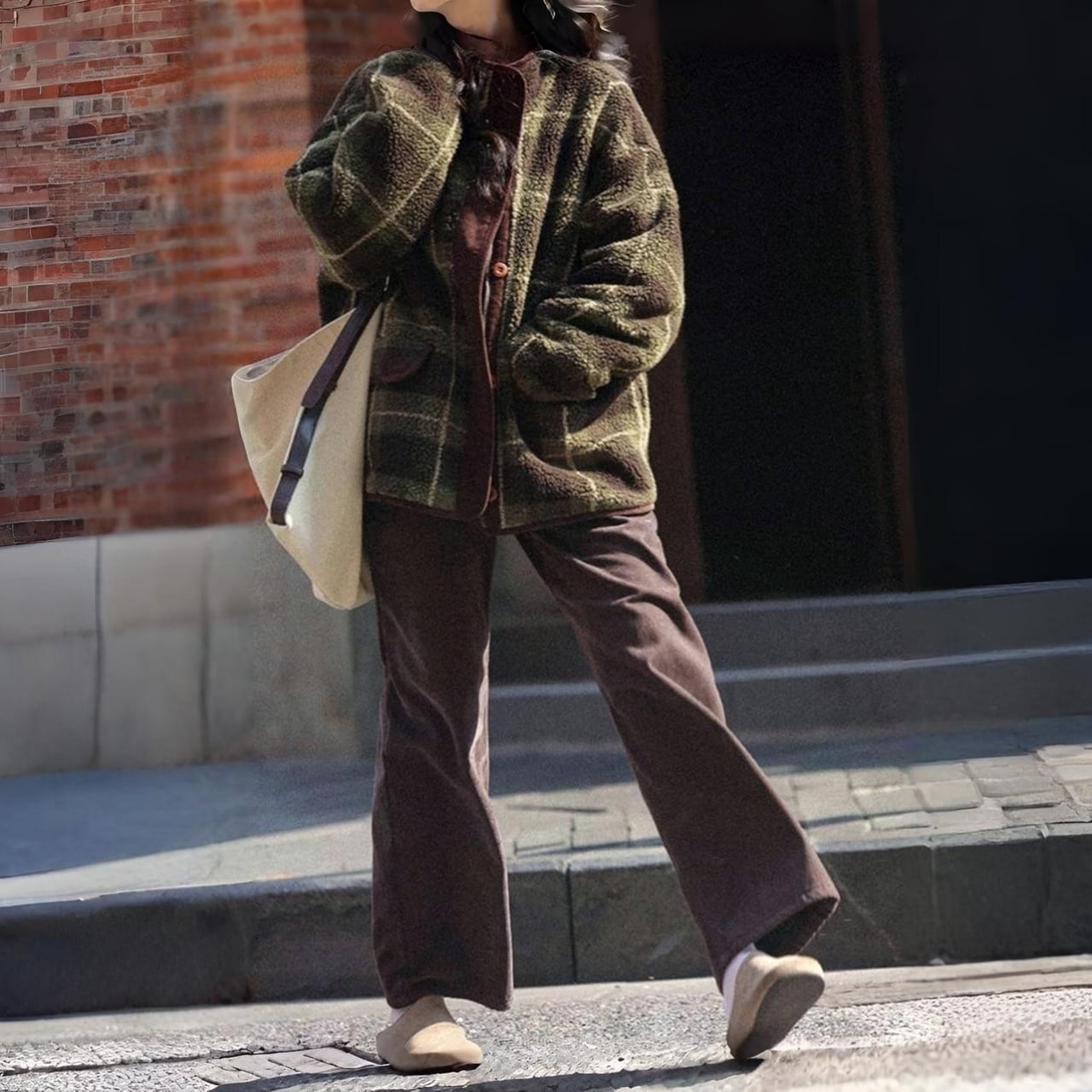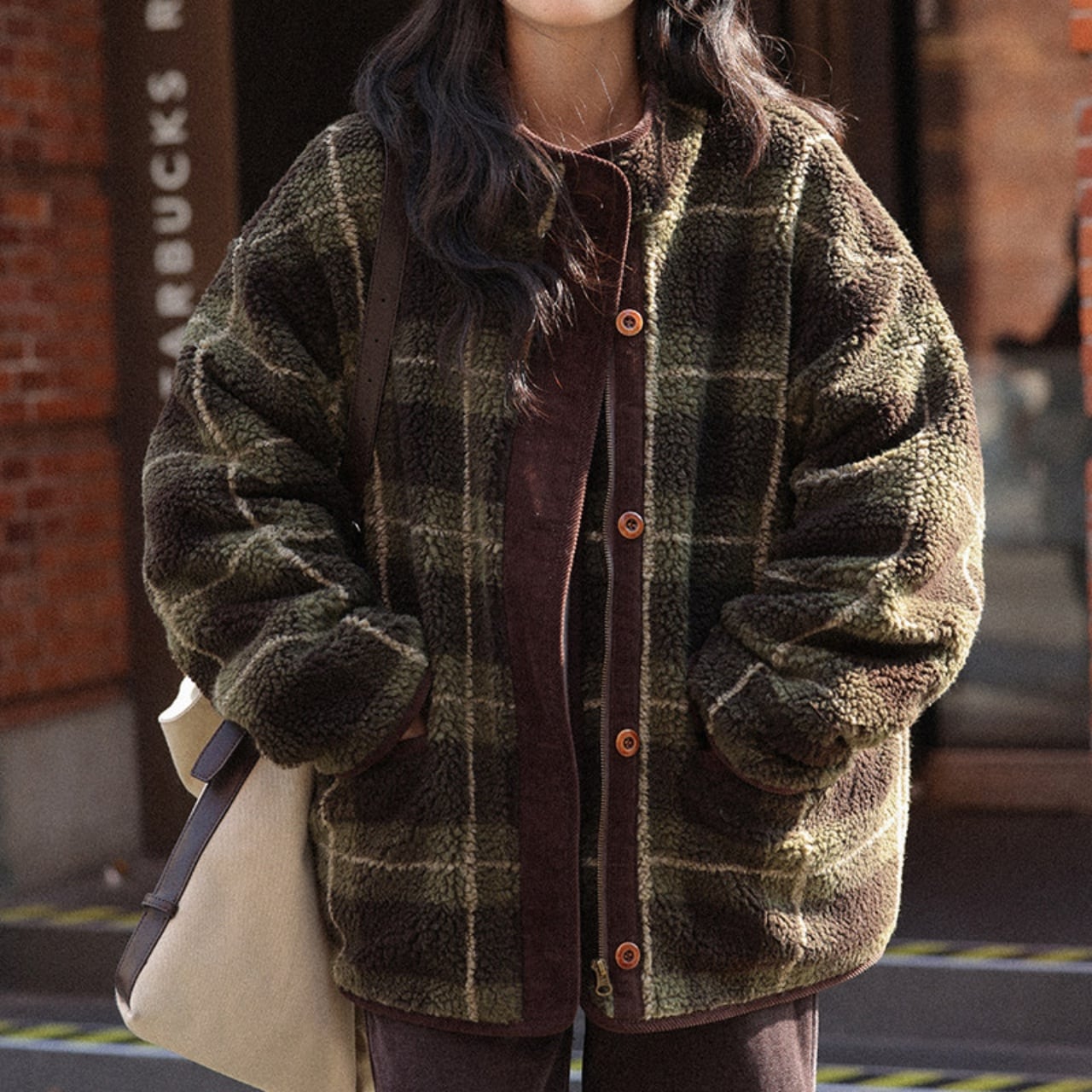 深みのあるグリーンの大柄チェックが、冬の装いにクラシカルな温かみを添えます。