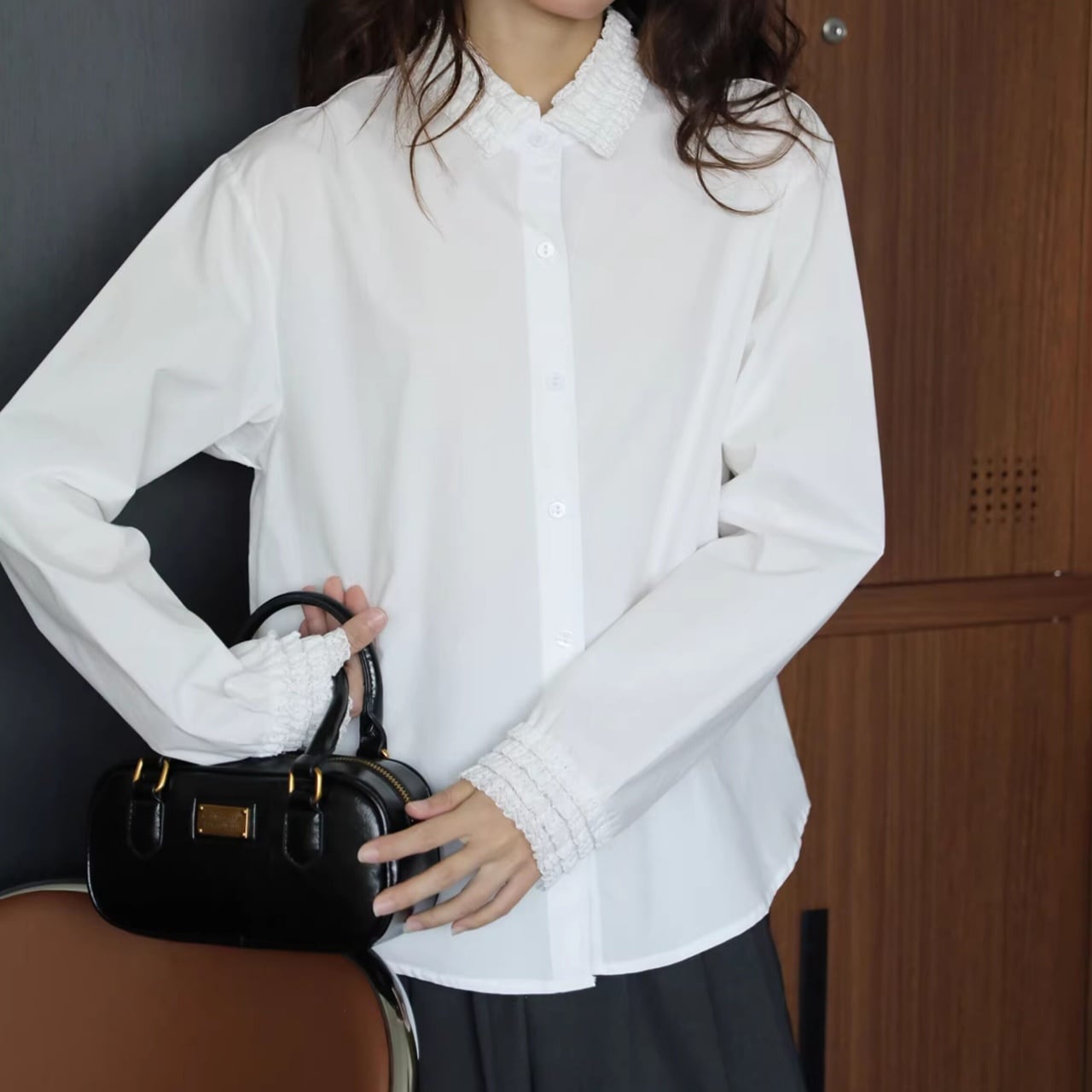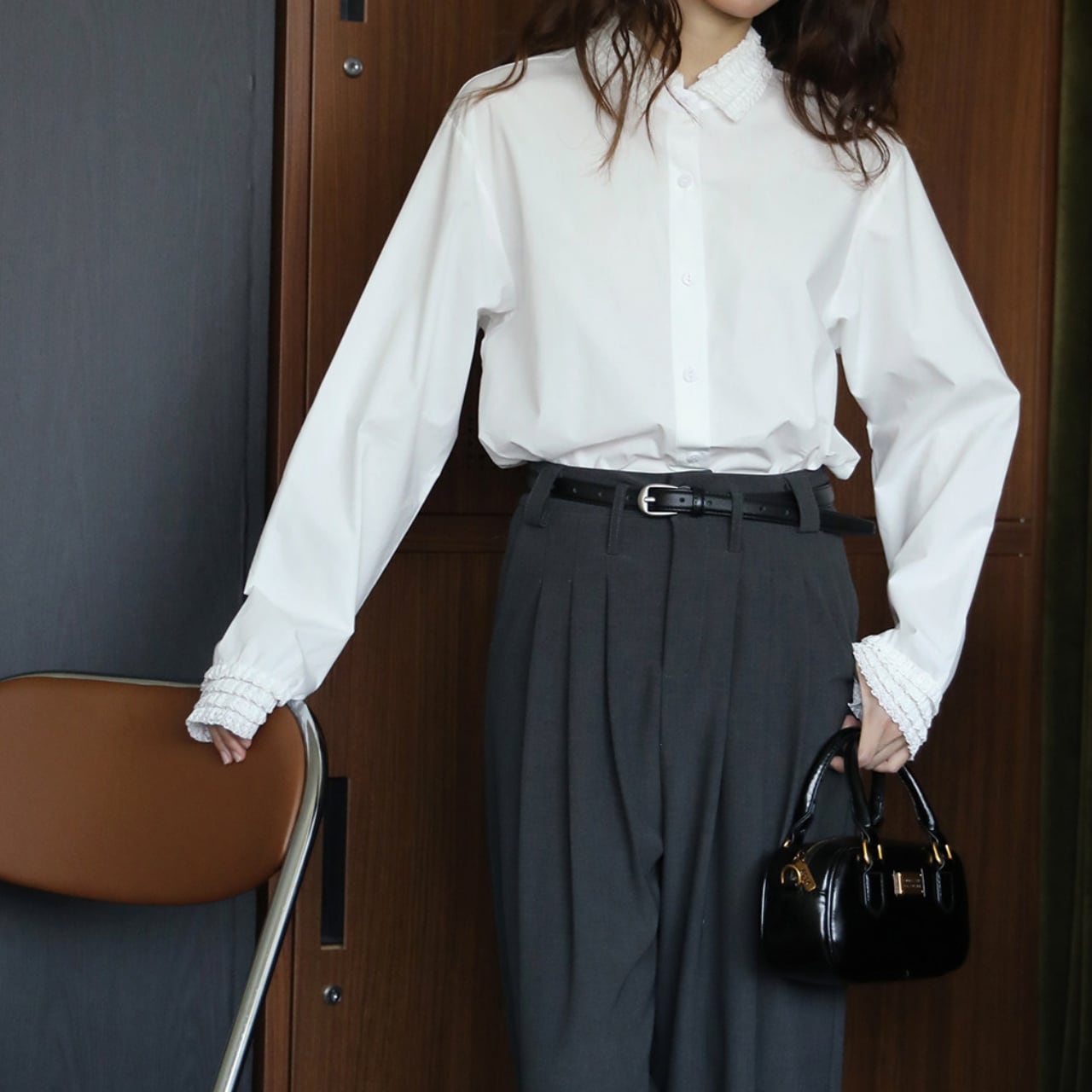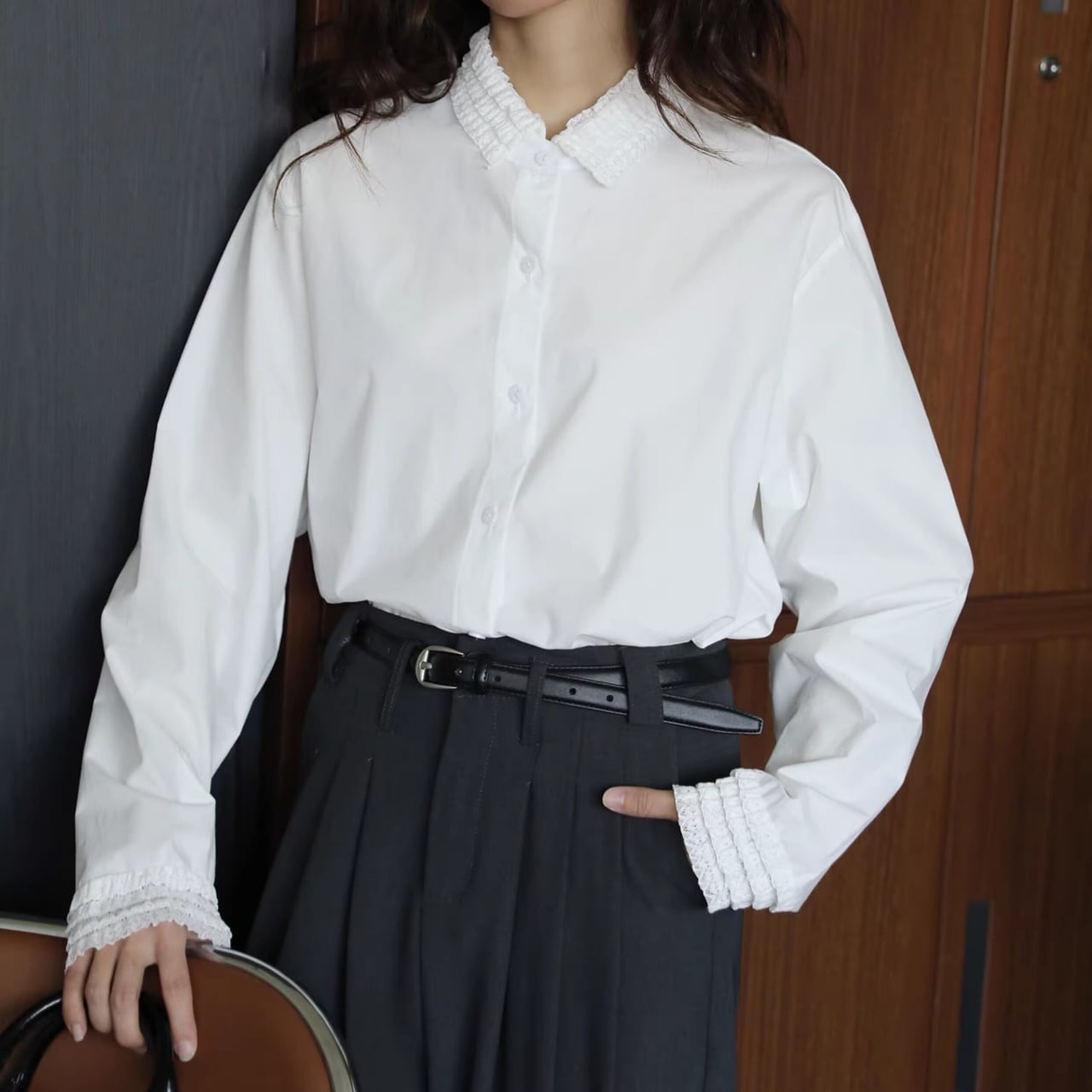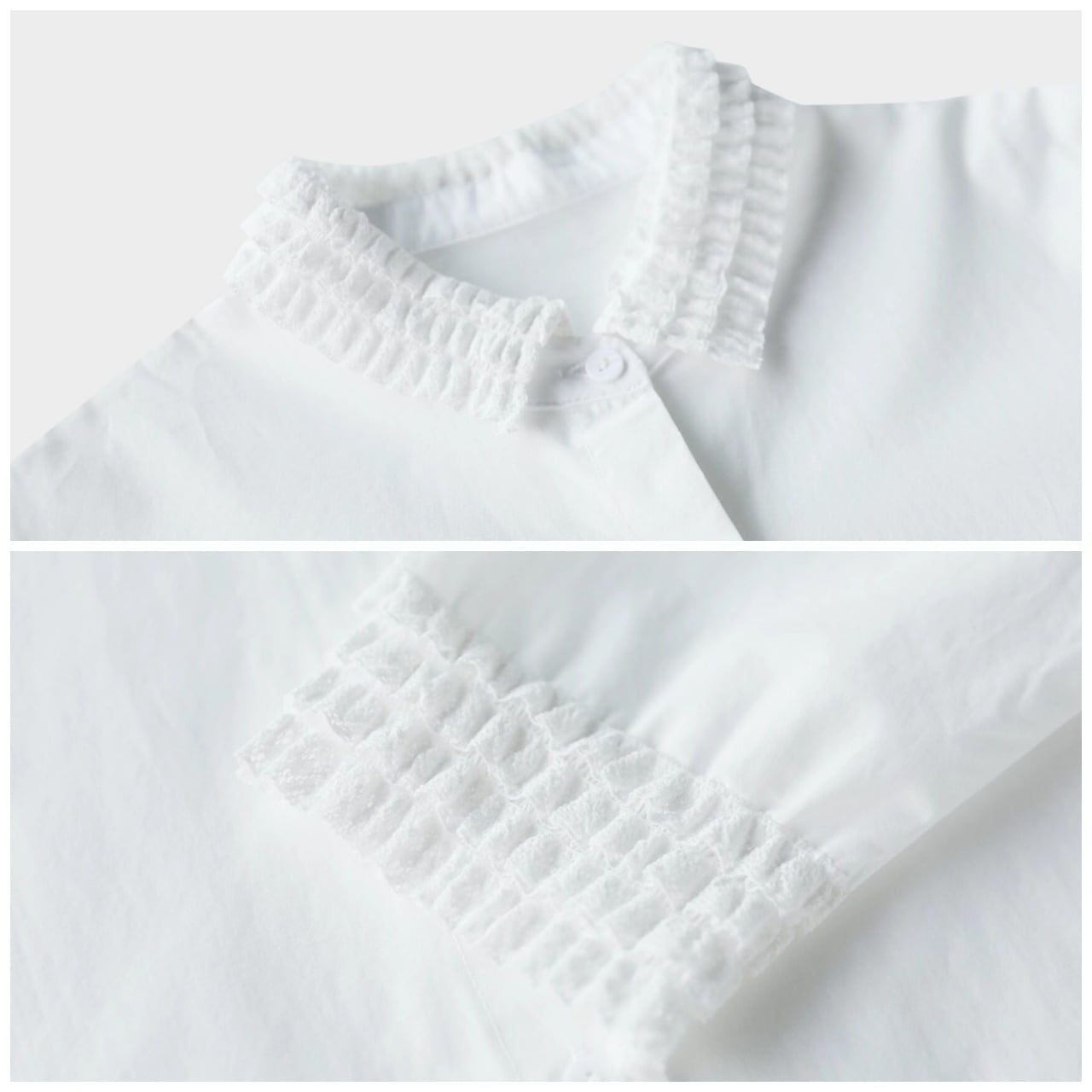 襟元と袖口にあしらわれた繊細なフリルが、装いを華やかに彩る一枚。
