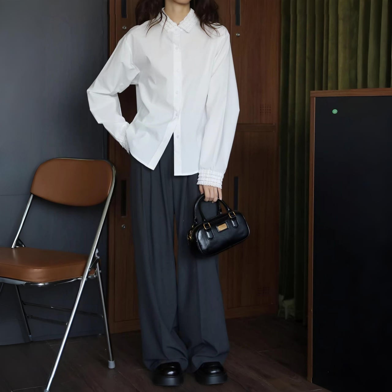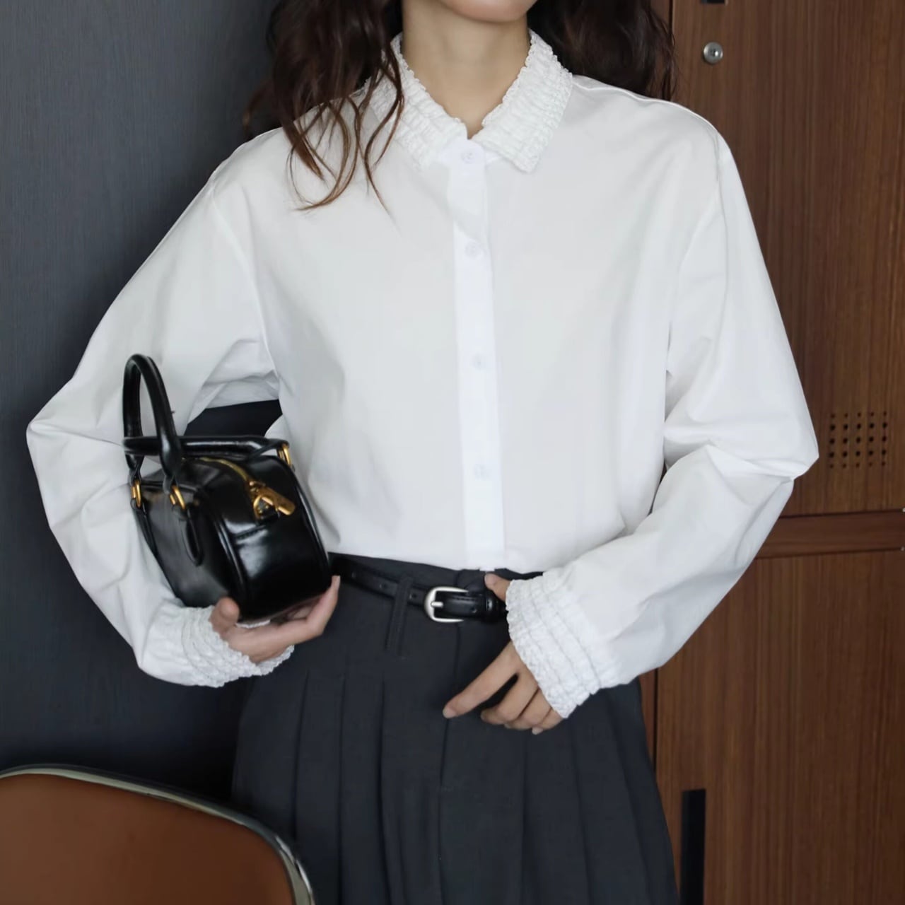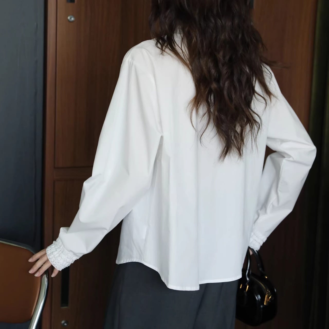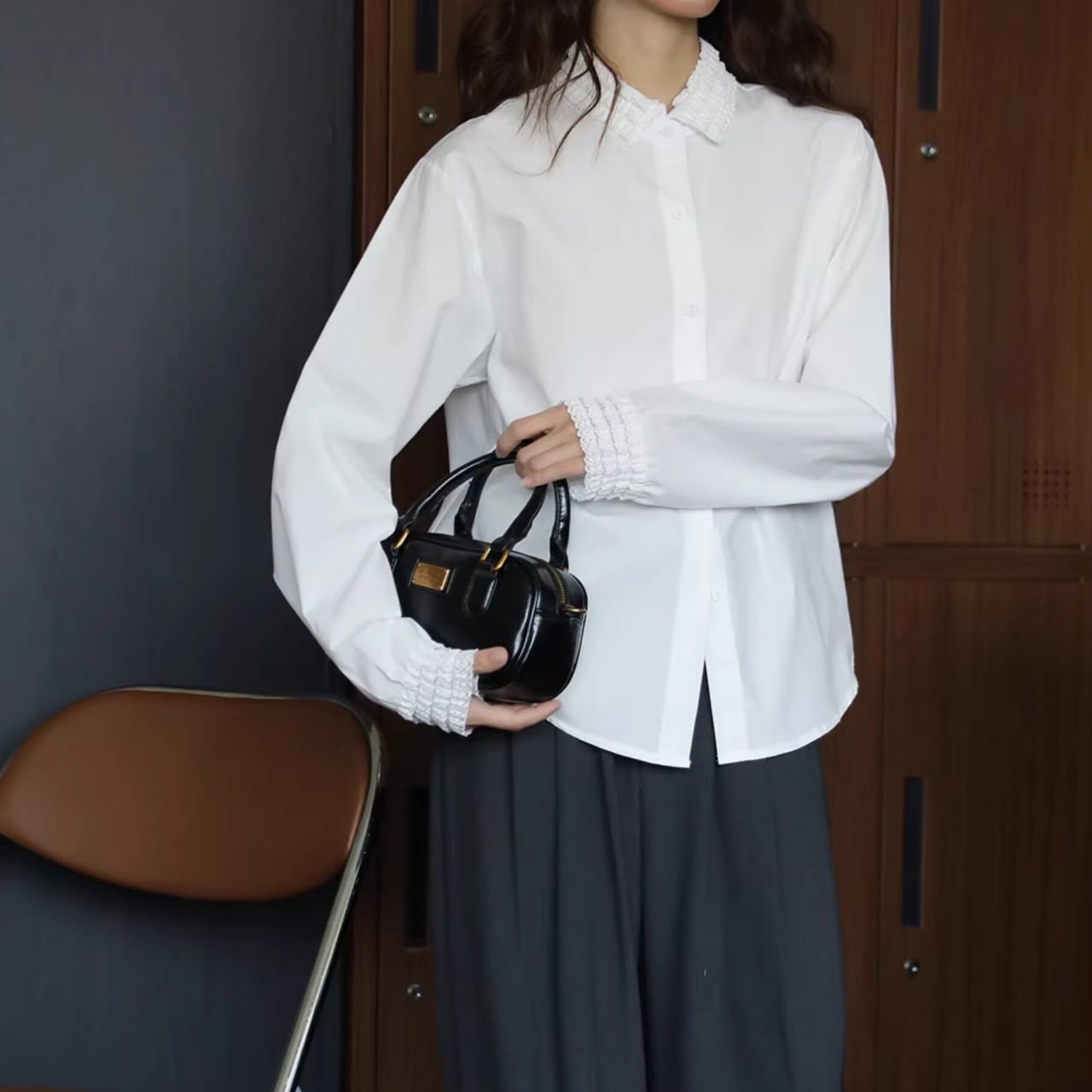 襟元と袖口にあしらわれた繊細なフリルが、装いを華やかに彩る一枚。