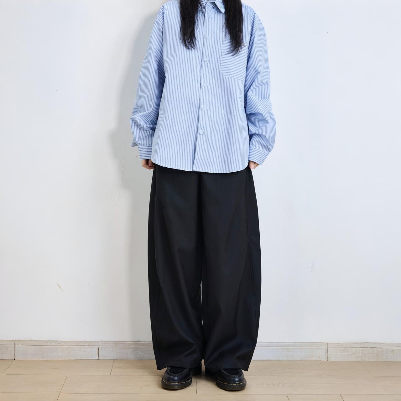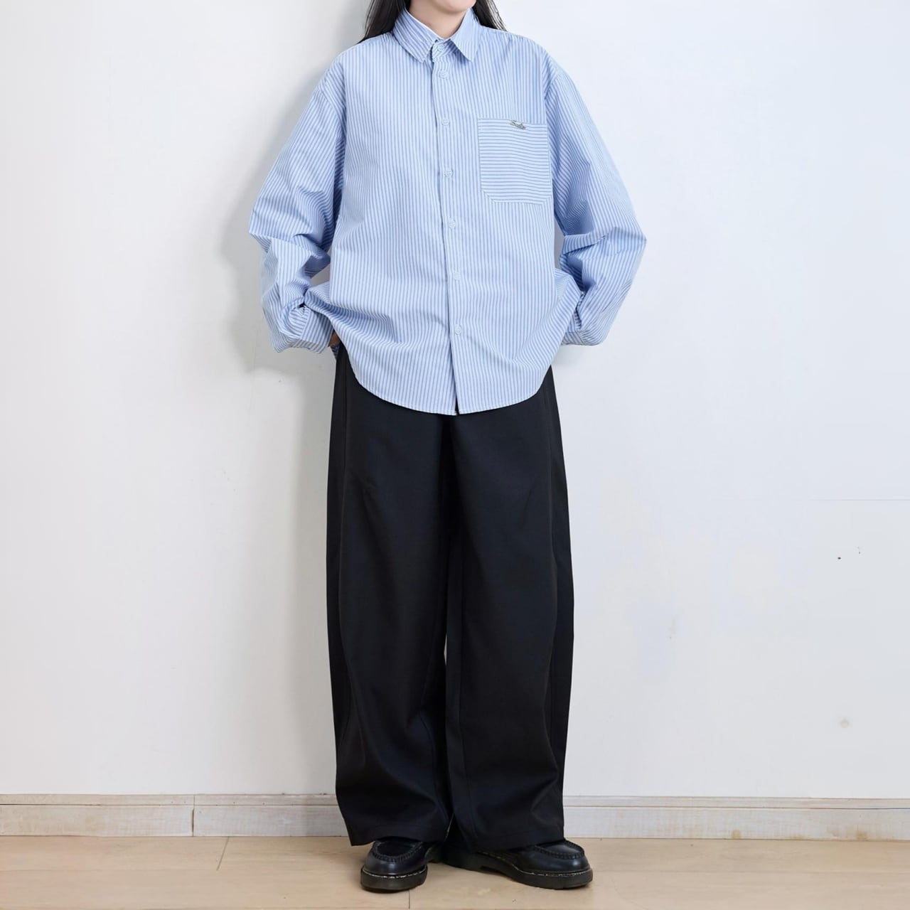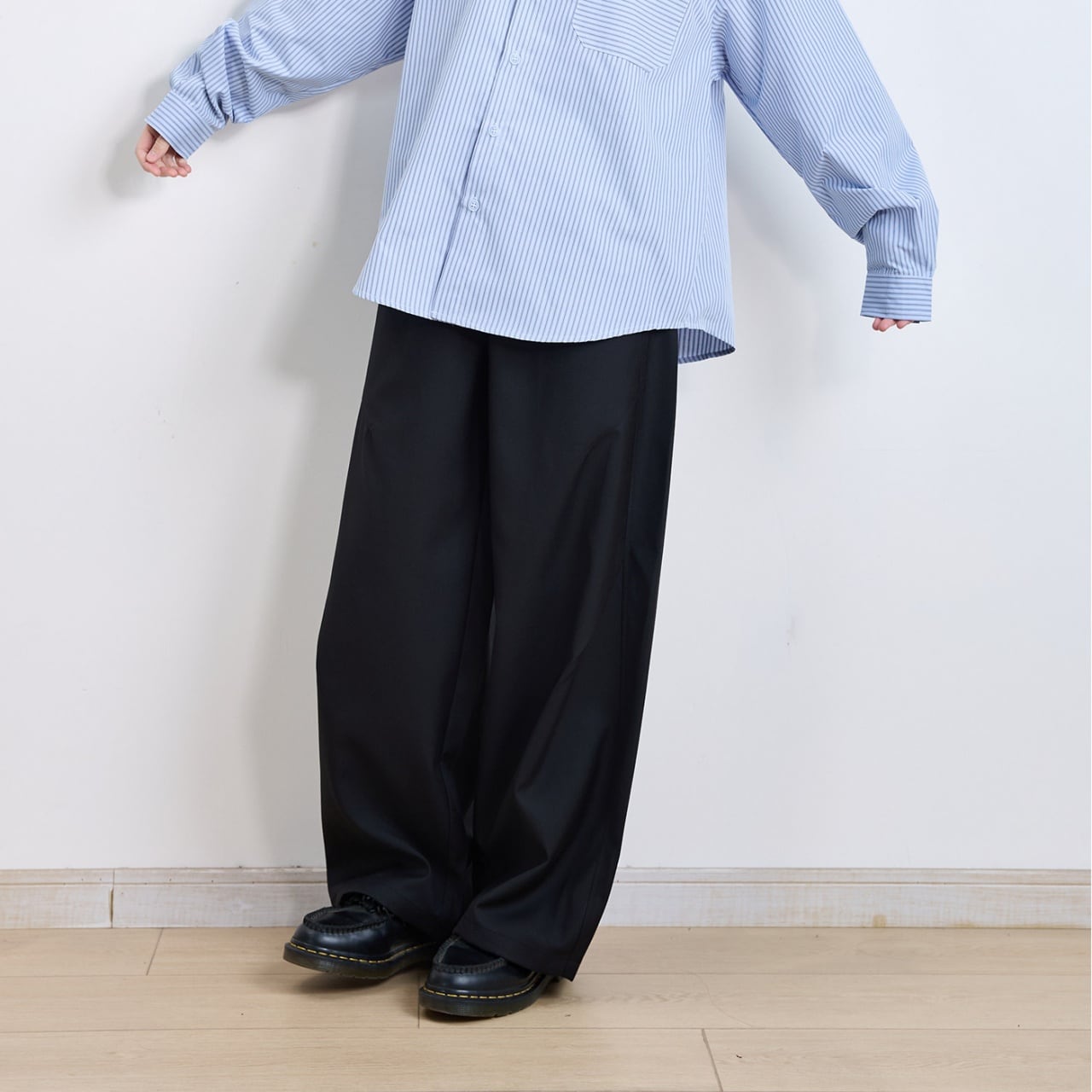 ボリューム感のあるワイドシルエットで、都会的なモードスタイルに。