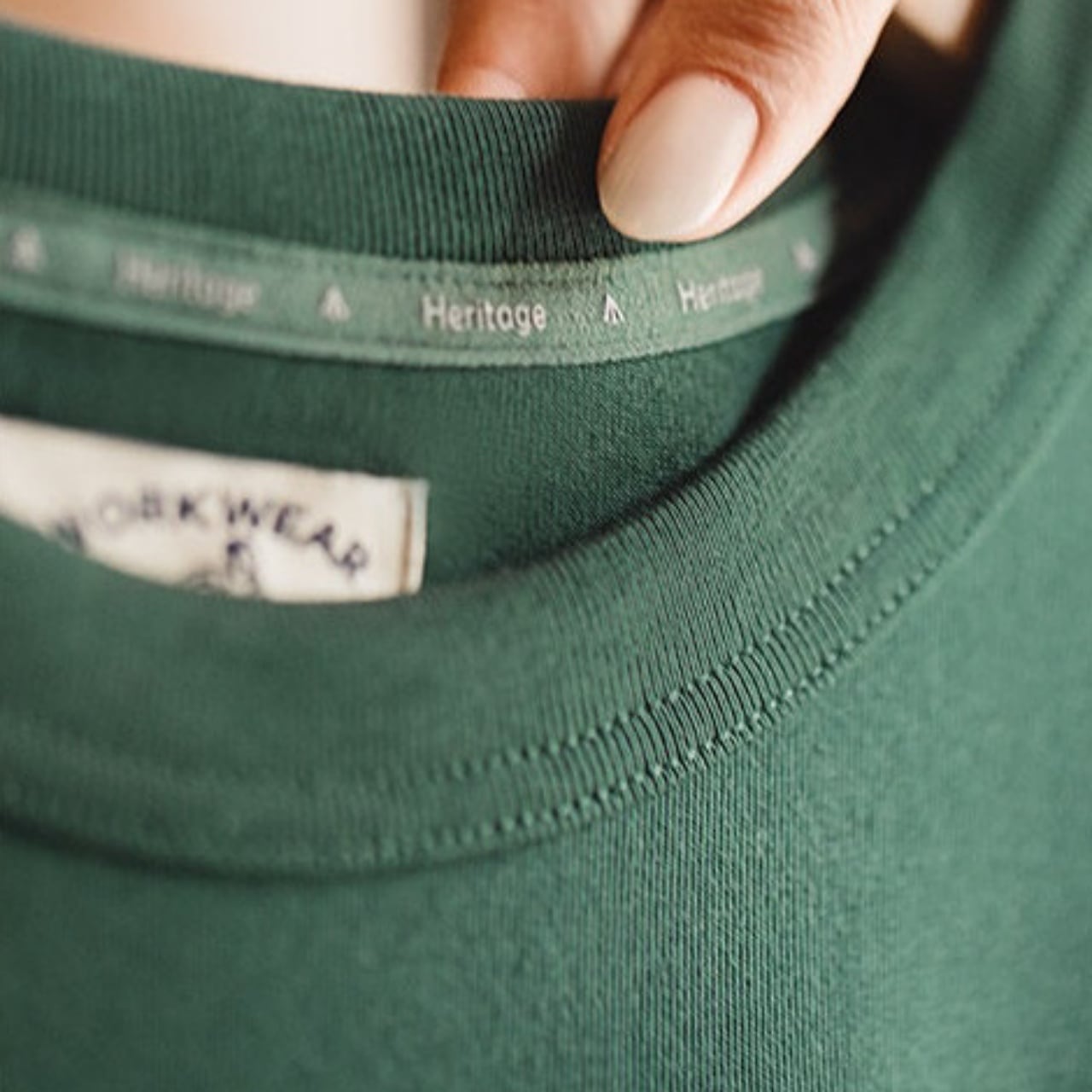 ヴィンテージライクなグリーンと、ロゴのストライプ状のテクスチャがクラシックなアメカジムードを演出。