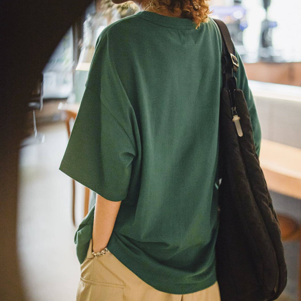 肩のラインが落ちたドロップショルダー仕様で、リラックス感のある着こなしに。