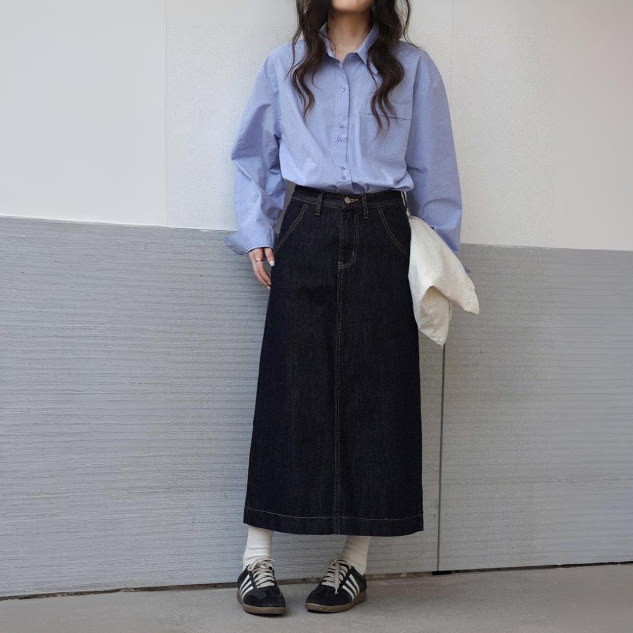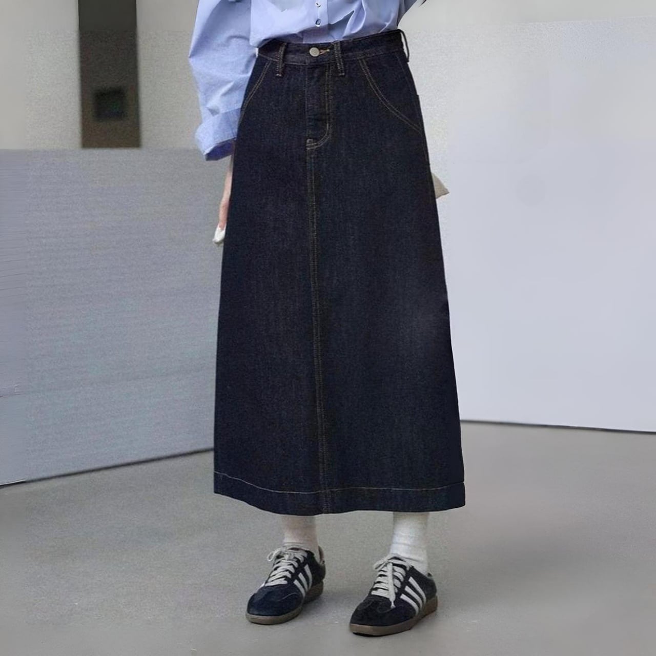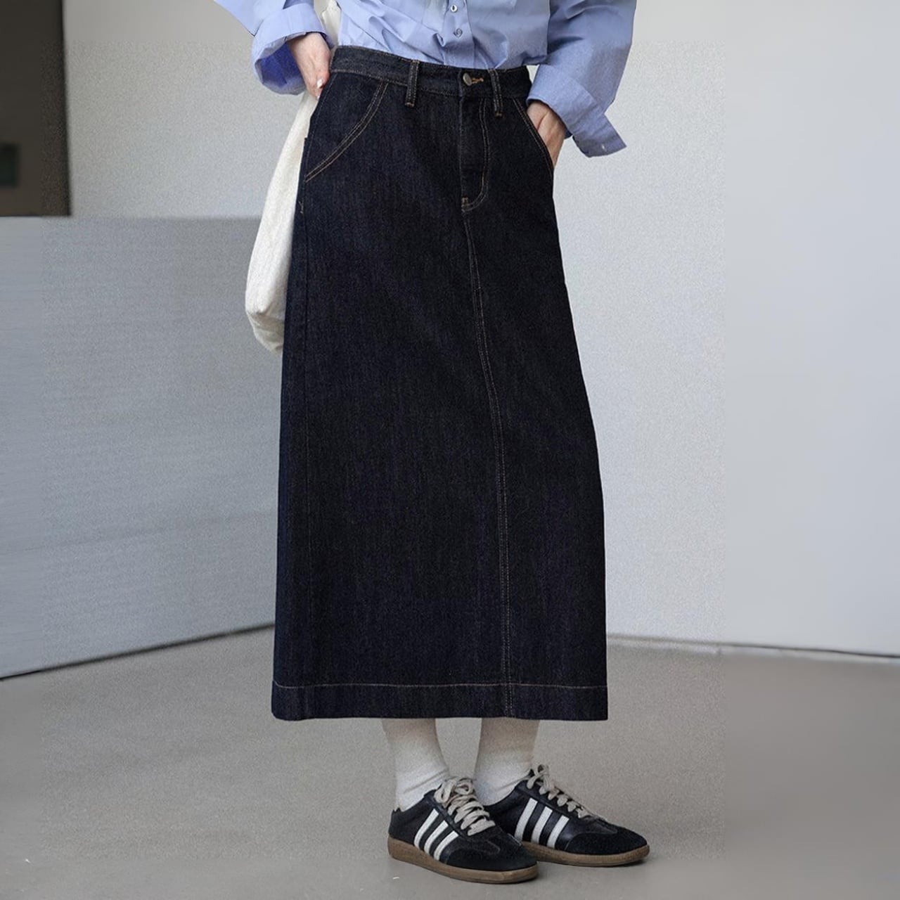 どの角度から見ても美しいシルエットが際立つデニムスカート。