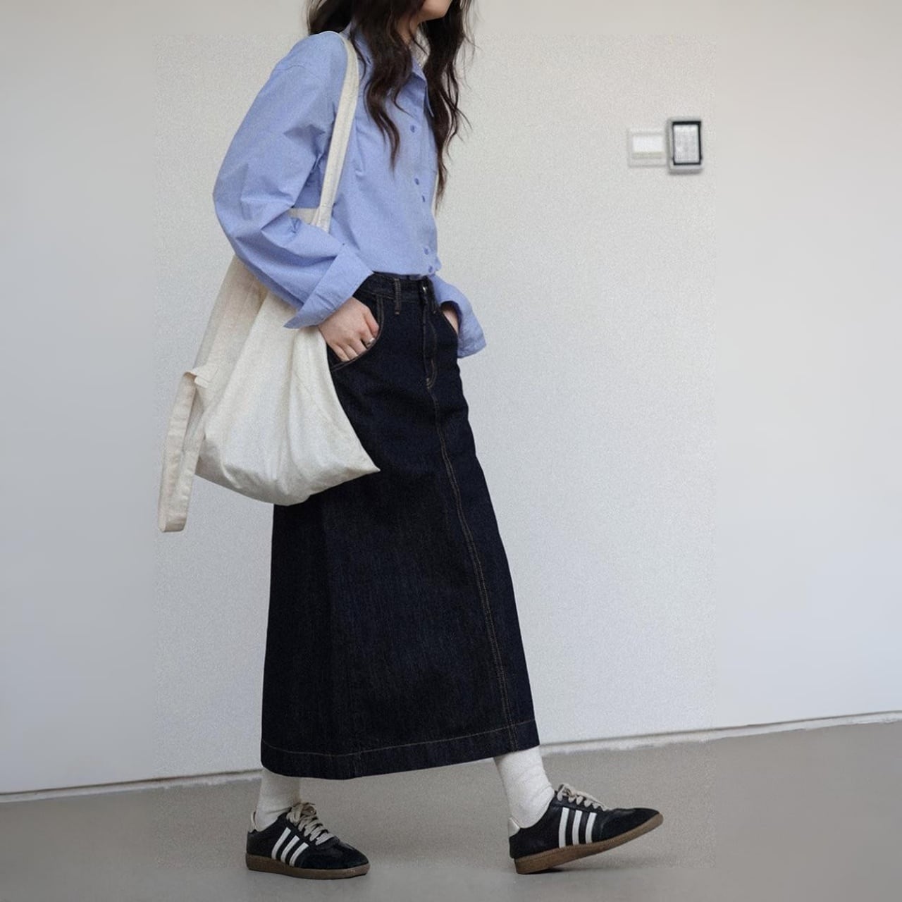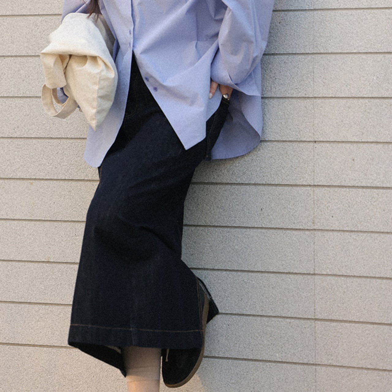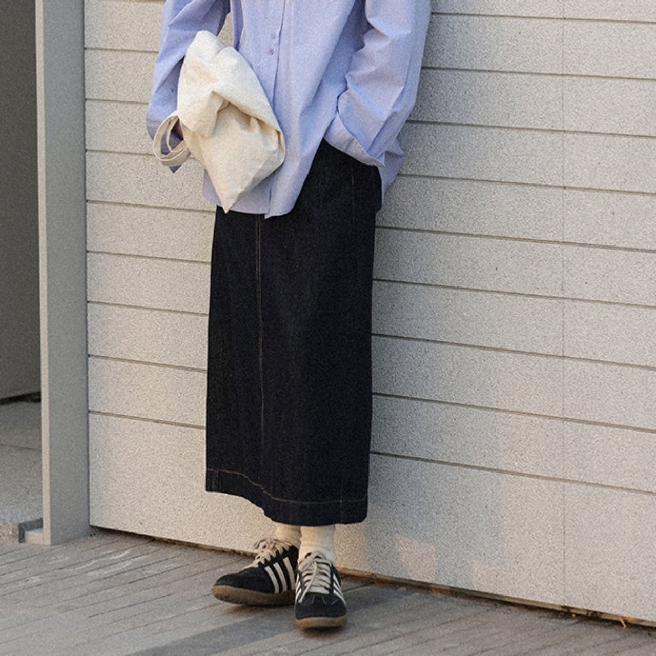 どの角度から見ても美しいシルエットが際立つデニムスカート。