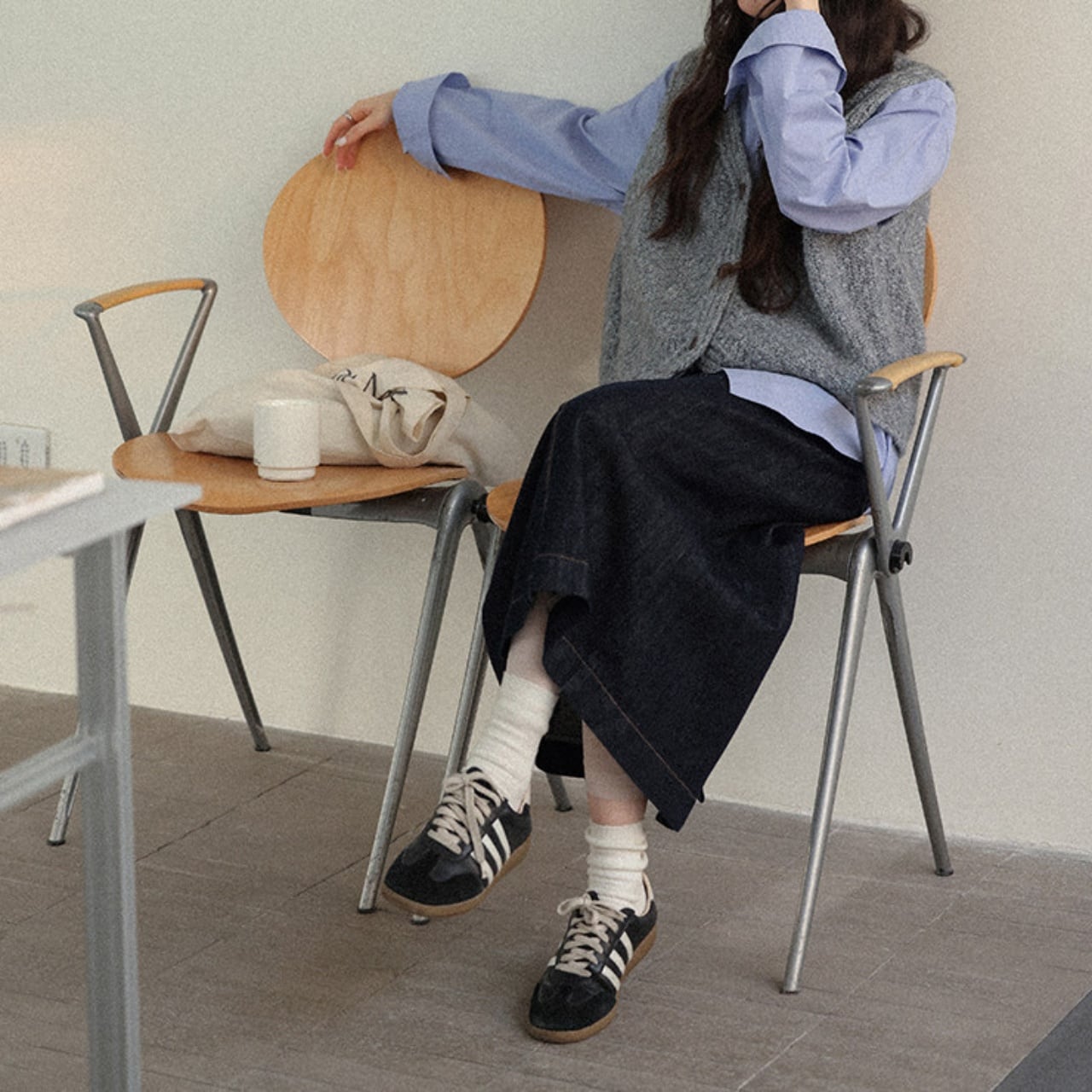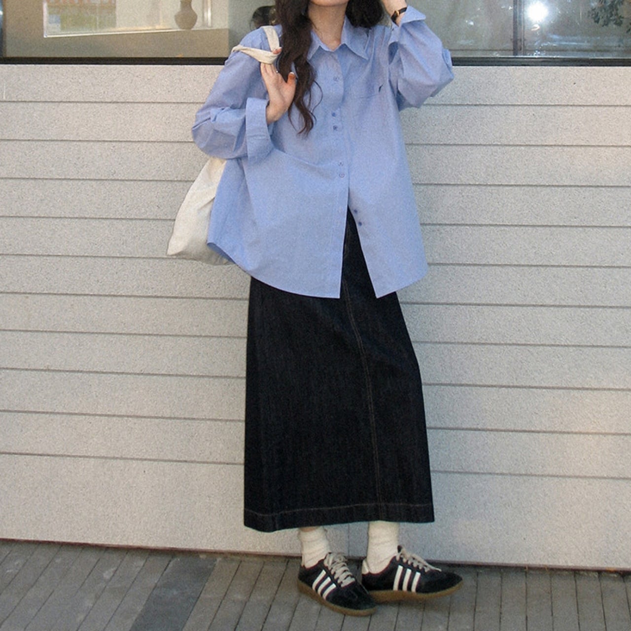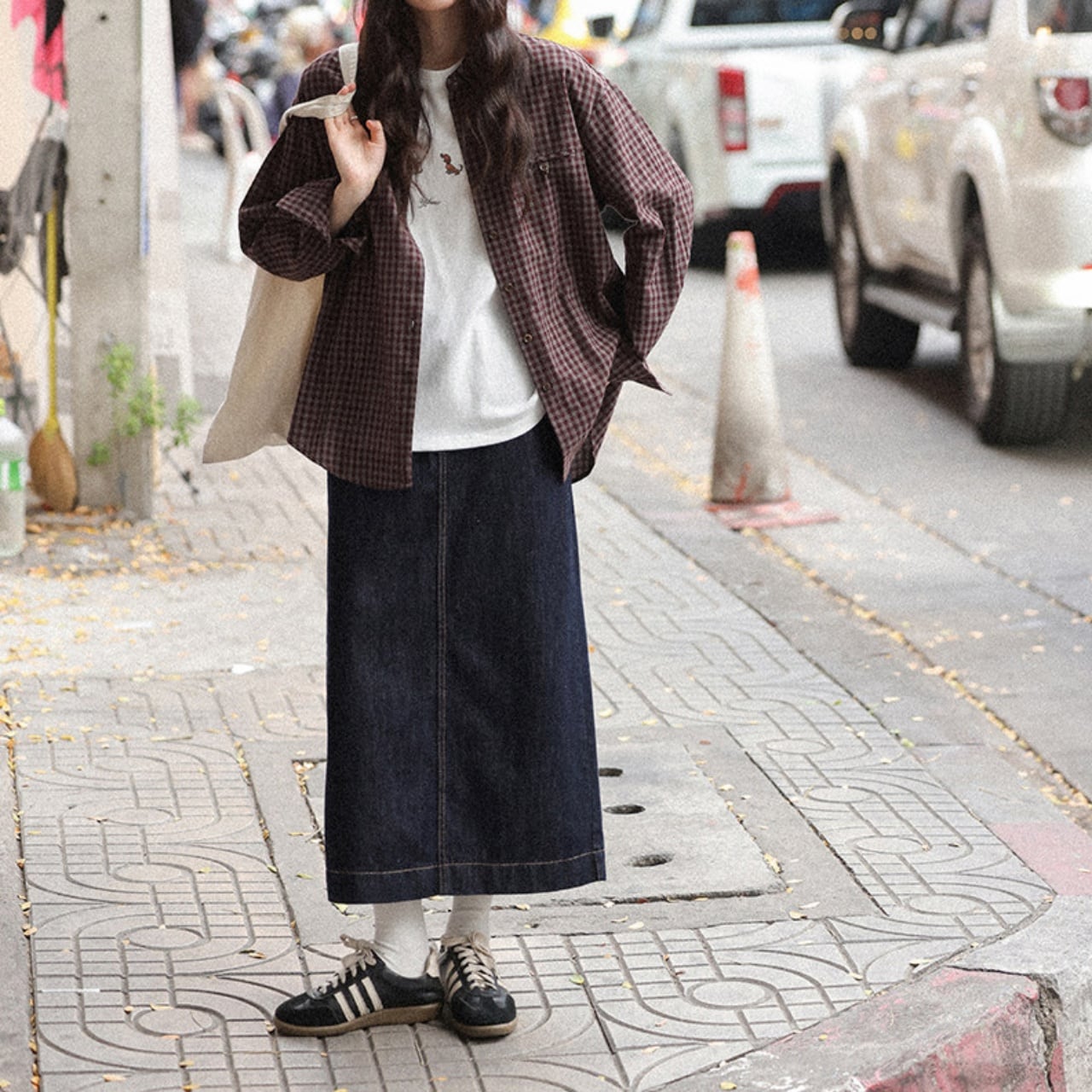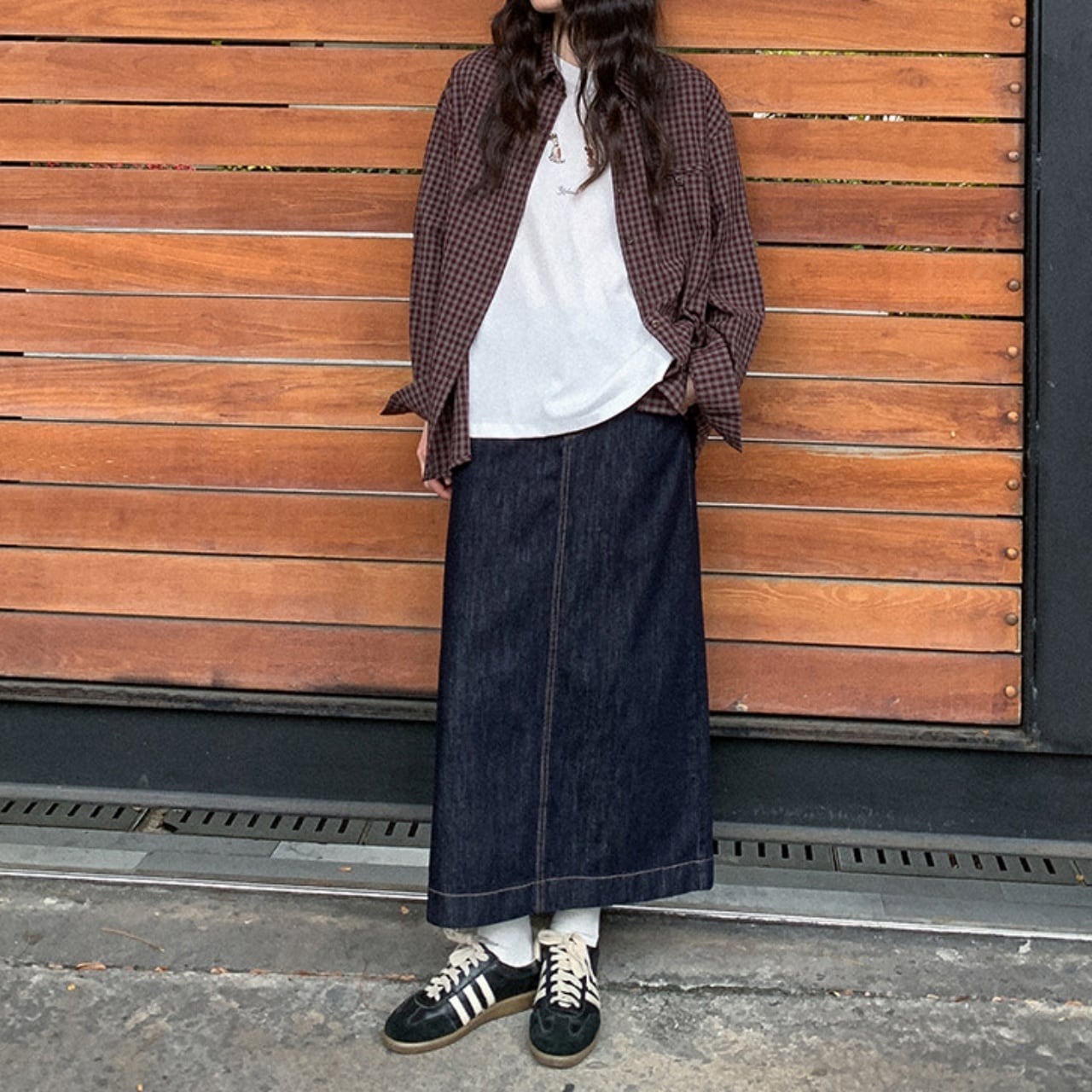広がりすぎないAラインが、大人のカジュアルスタイルをきれいに演出。