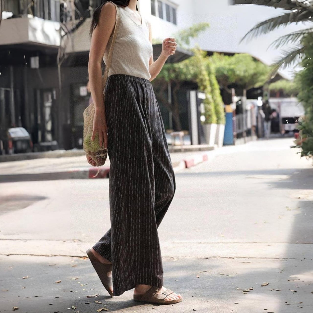 ステッチ風ストライプが印象的なイージーパンツ。