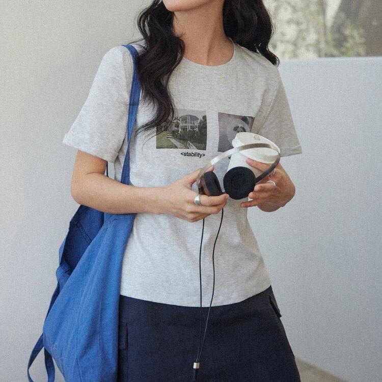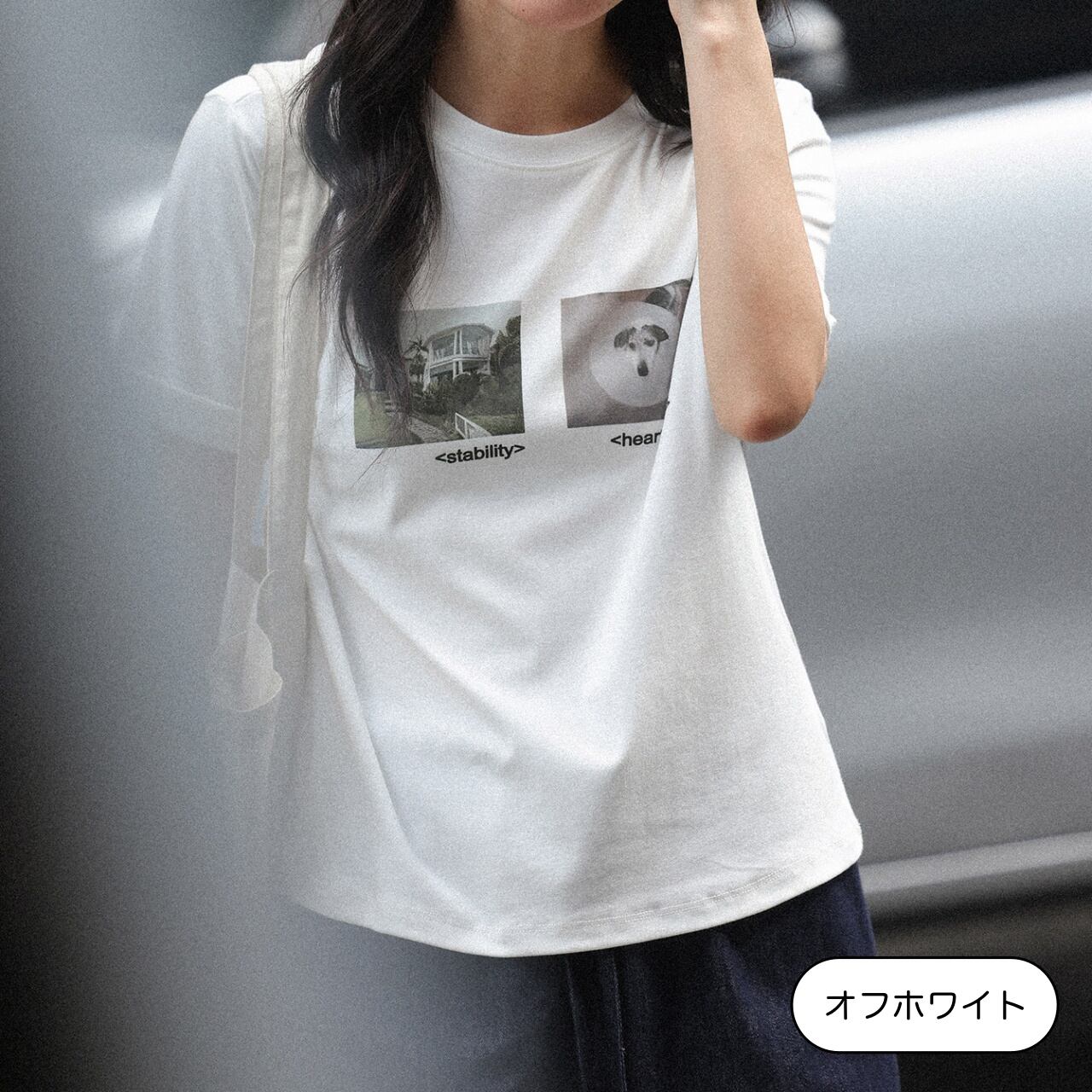 フロントに配したフォトグラフィックが印象的なTシャツ。