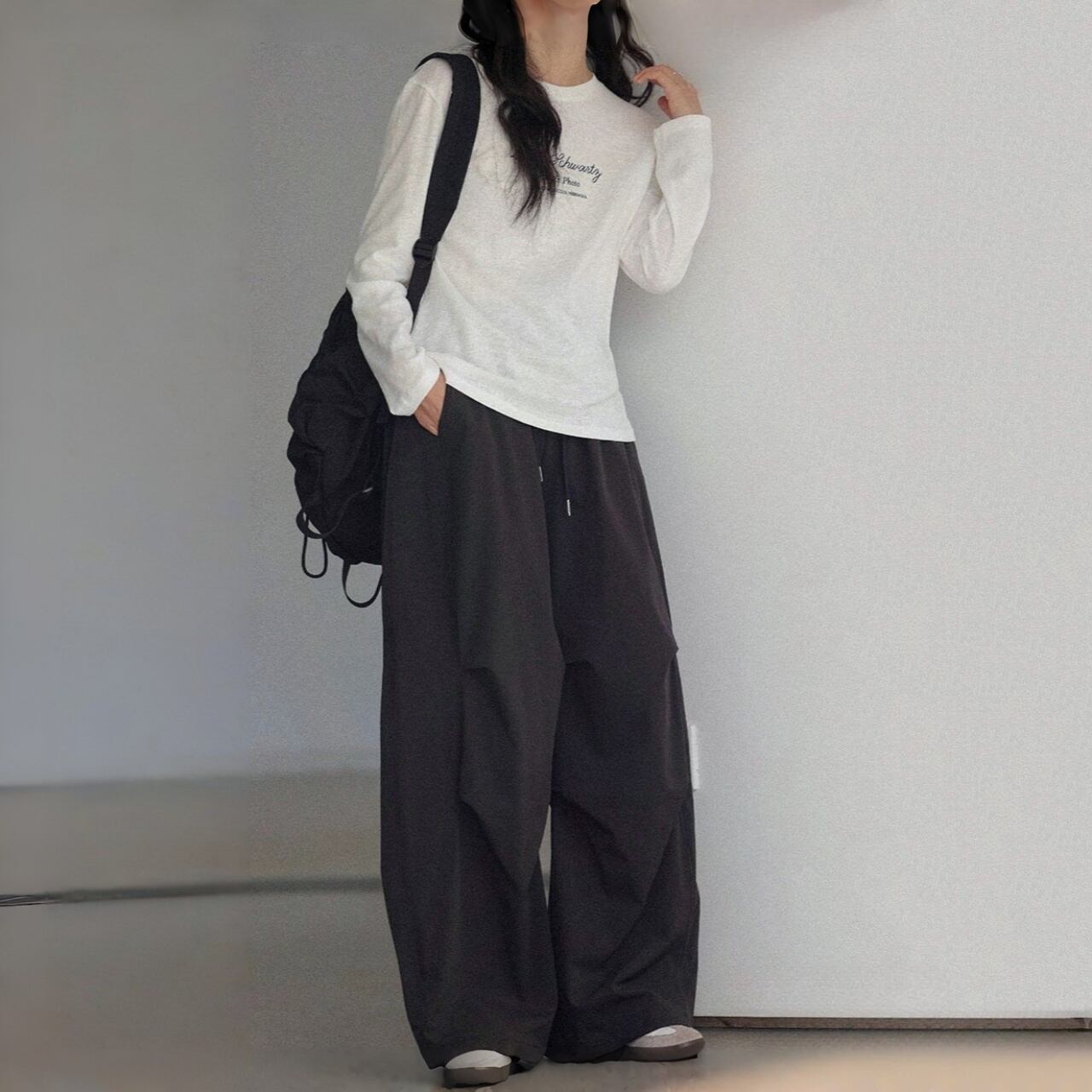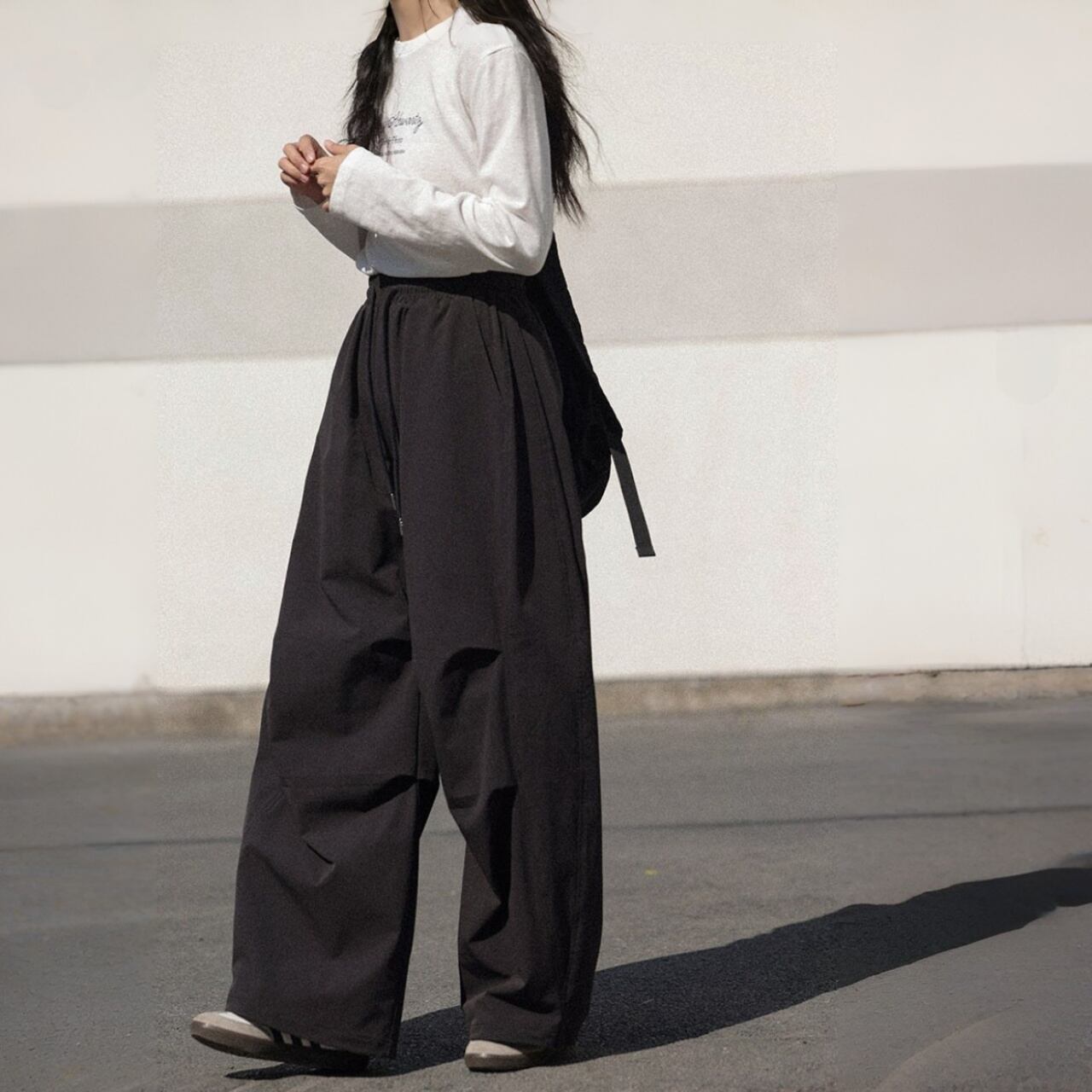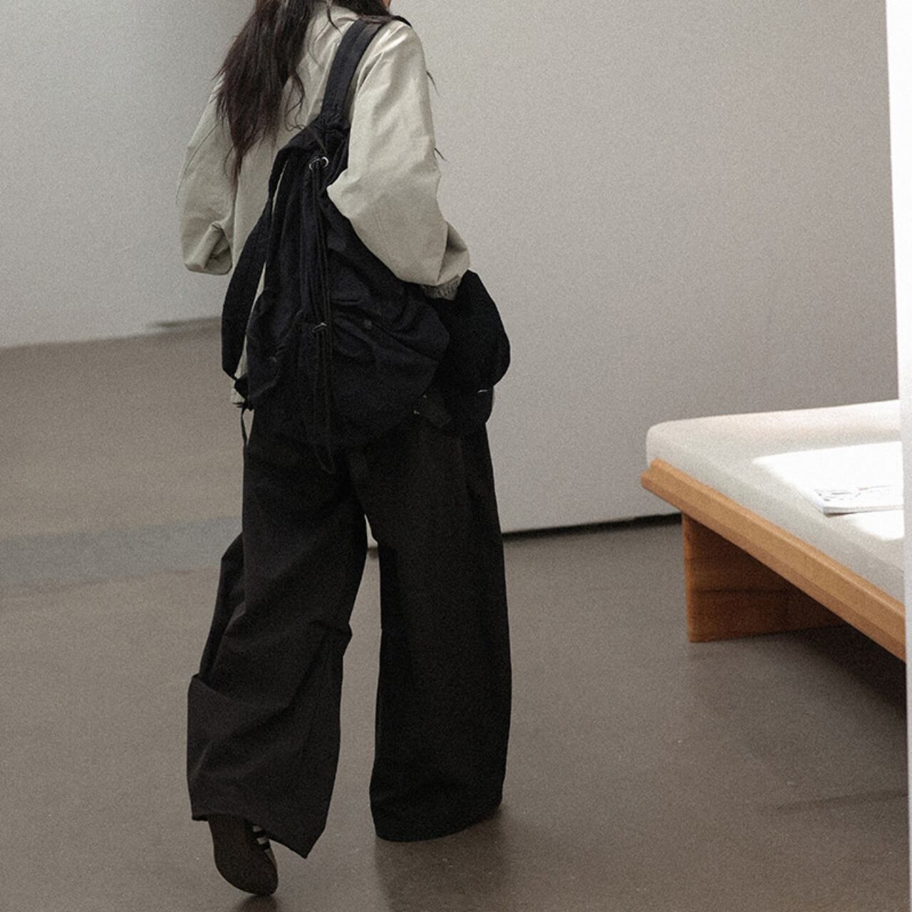 タックが生み出す立体感と、ワイドなシルエットで旬なスタイルに。