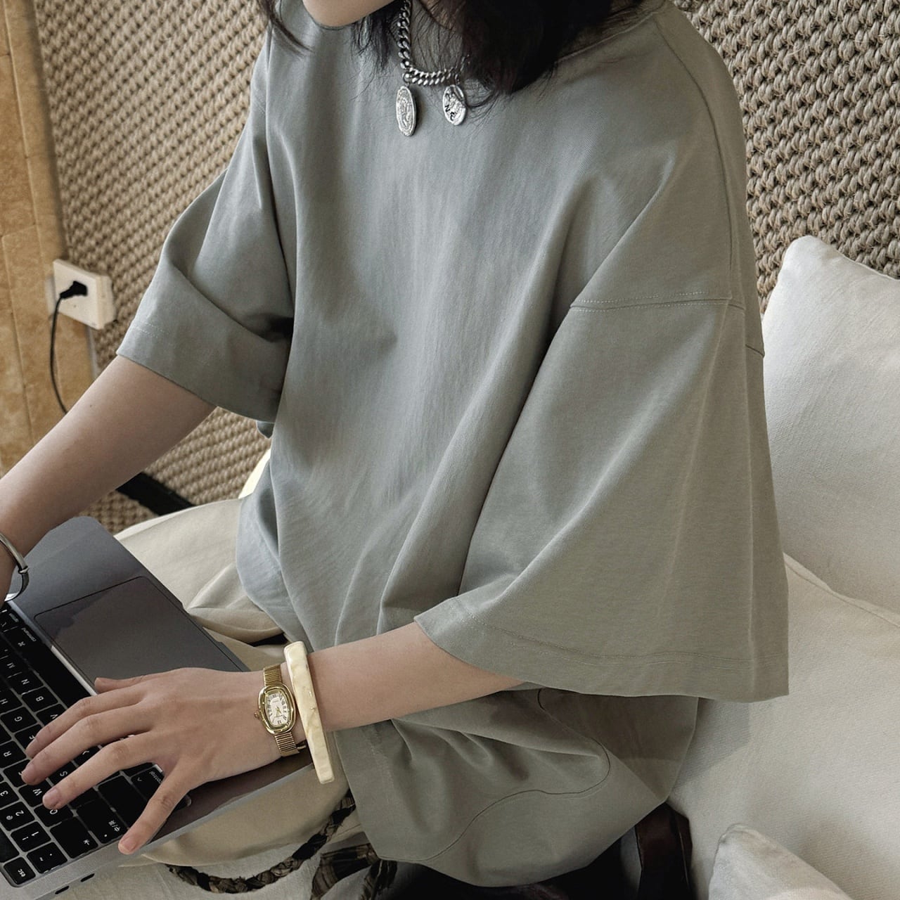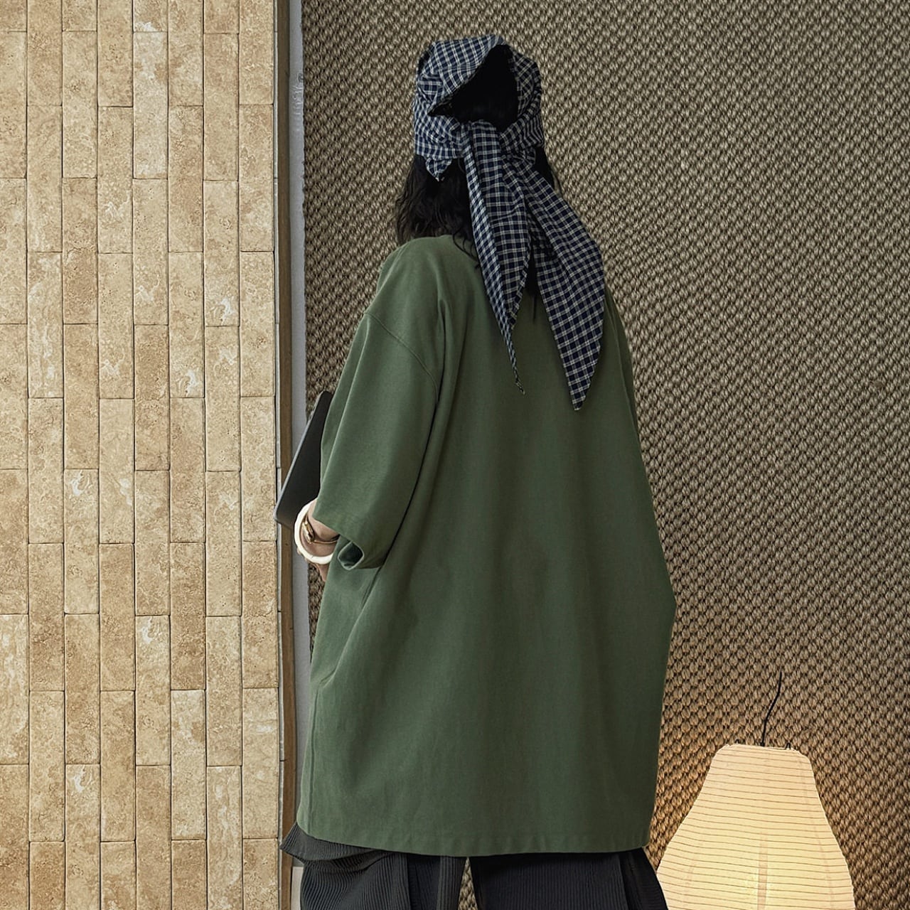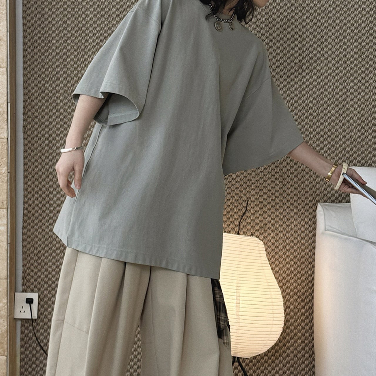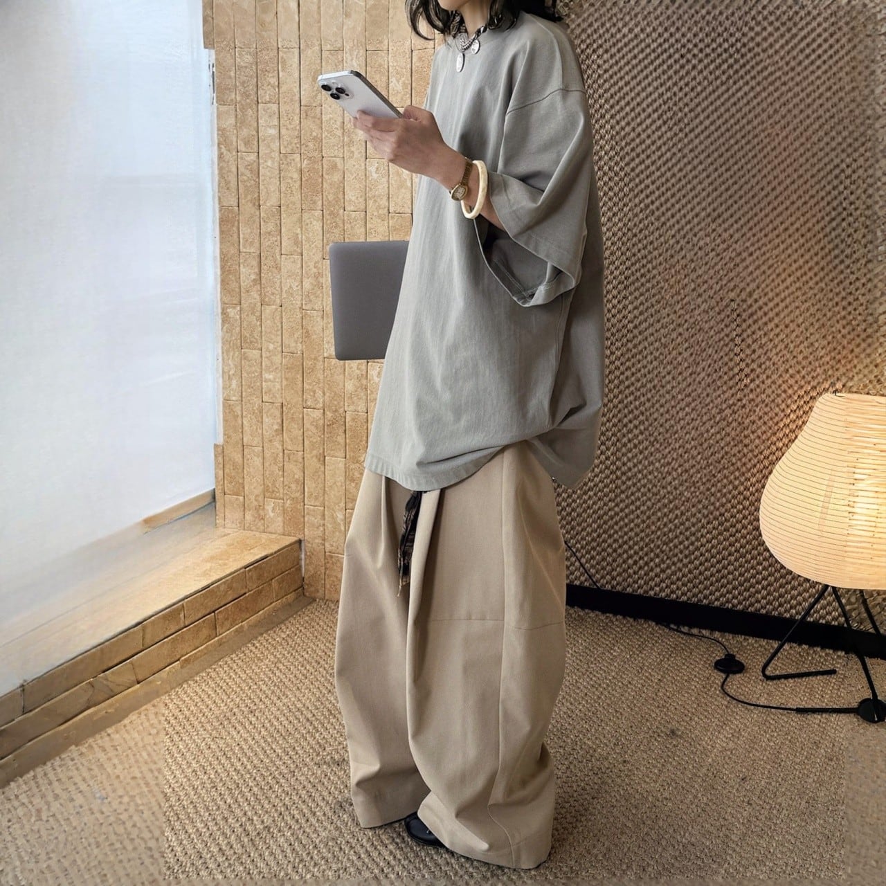 シンプルだからこそ、ボトムスや小物とのアレンジも自由自在です。