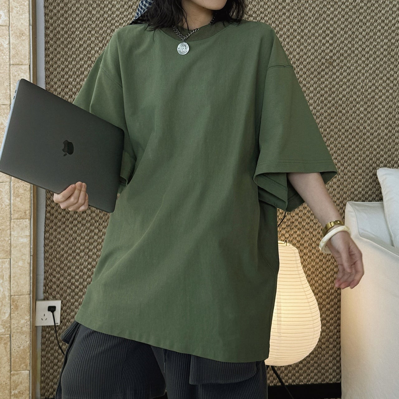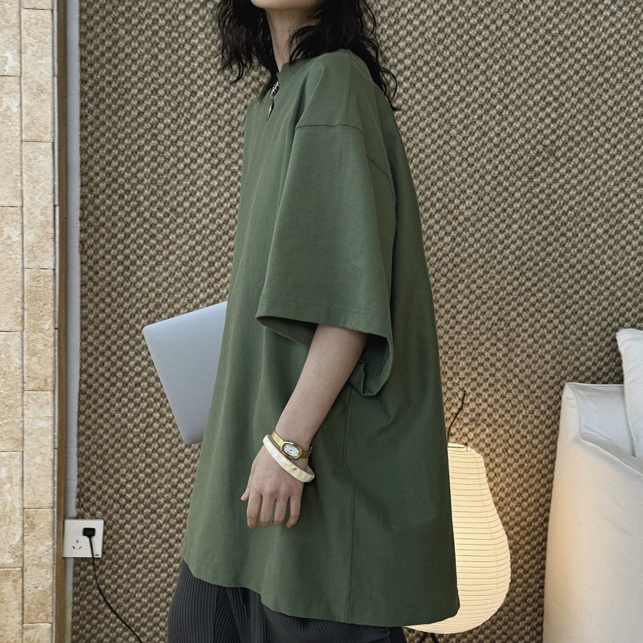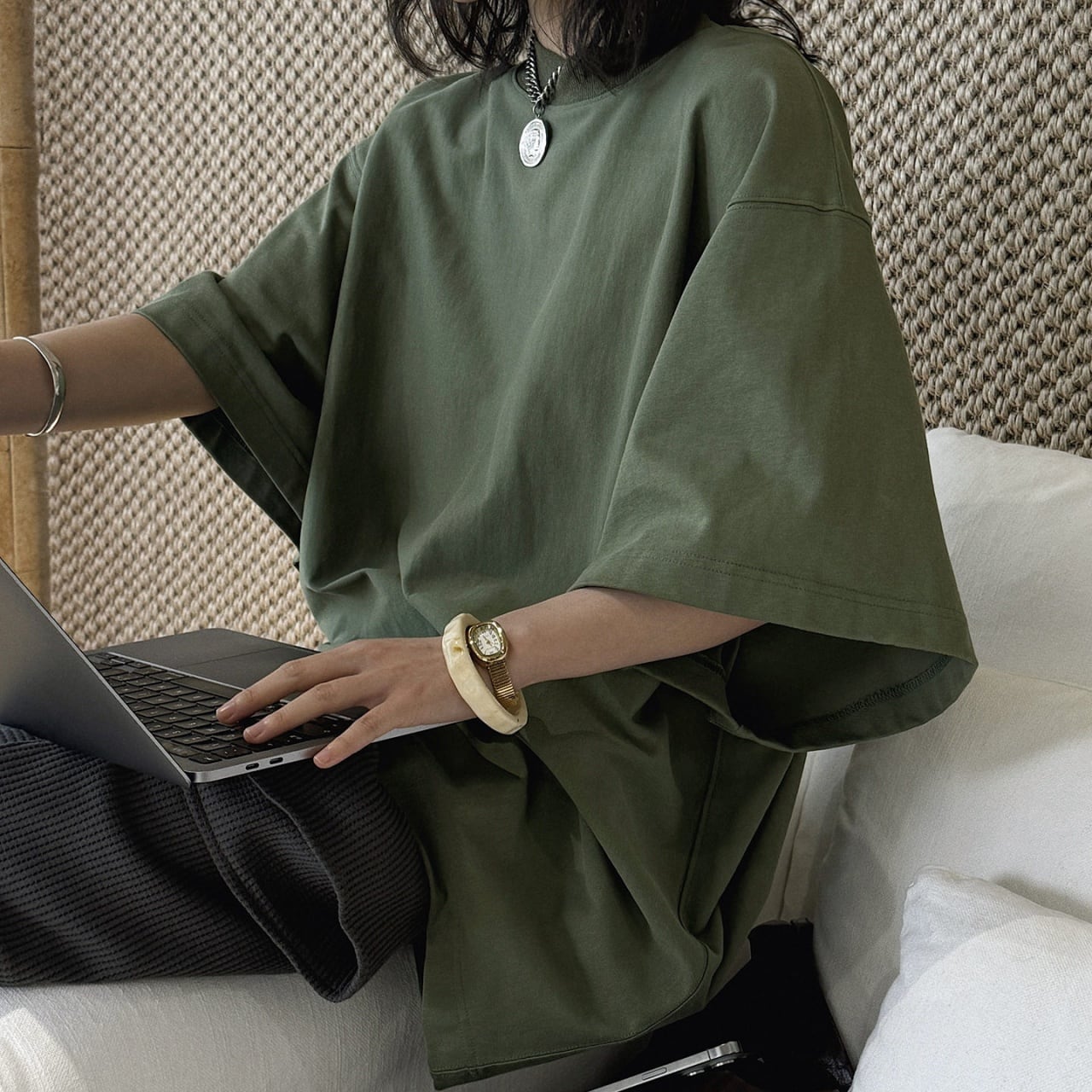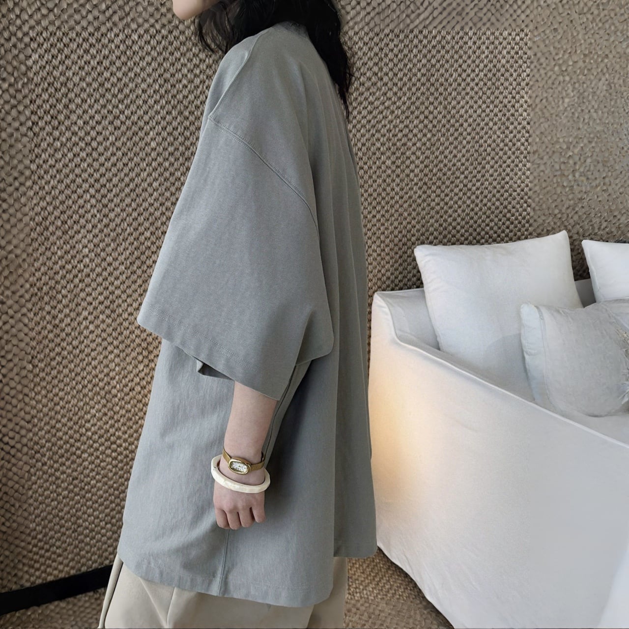 オーバーサイズとドロップショルダーが、旬な抜け感を演出。