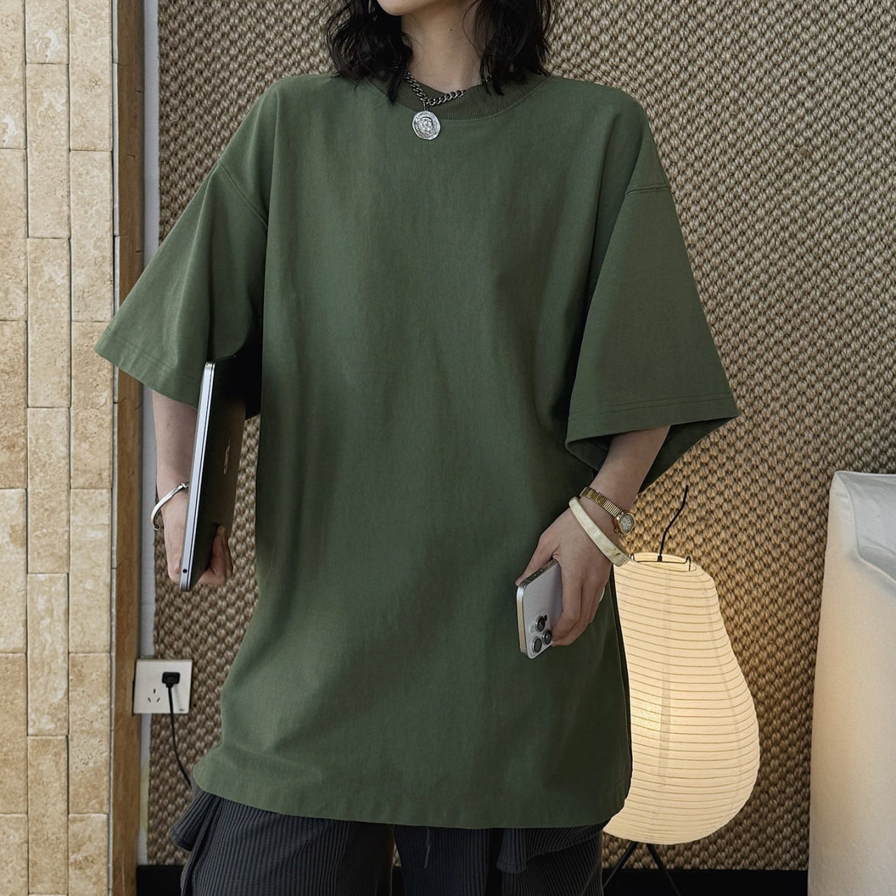 オーバーサイズクルーネックドロップショルダーロングTシャツ A02107