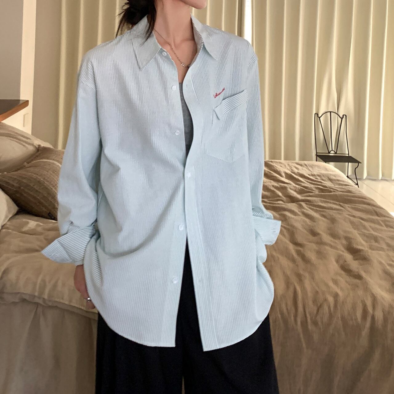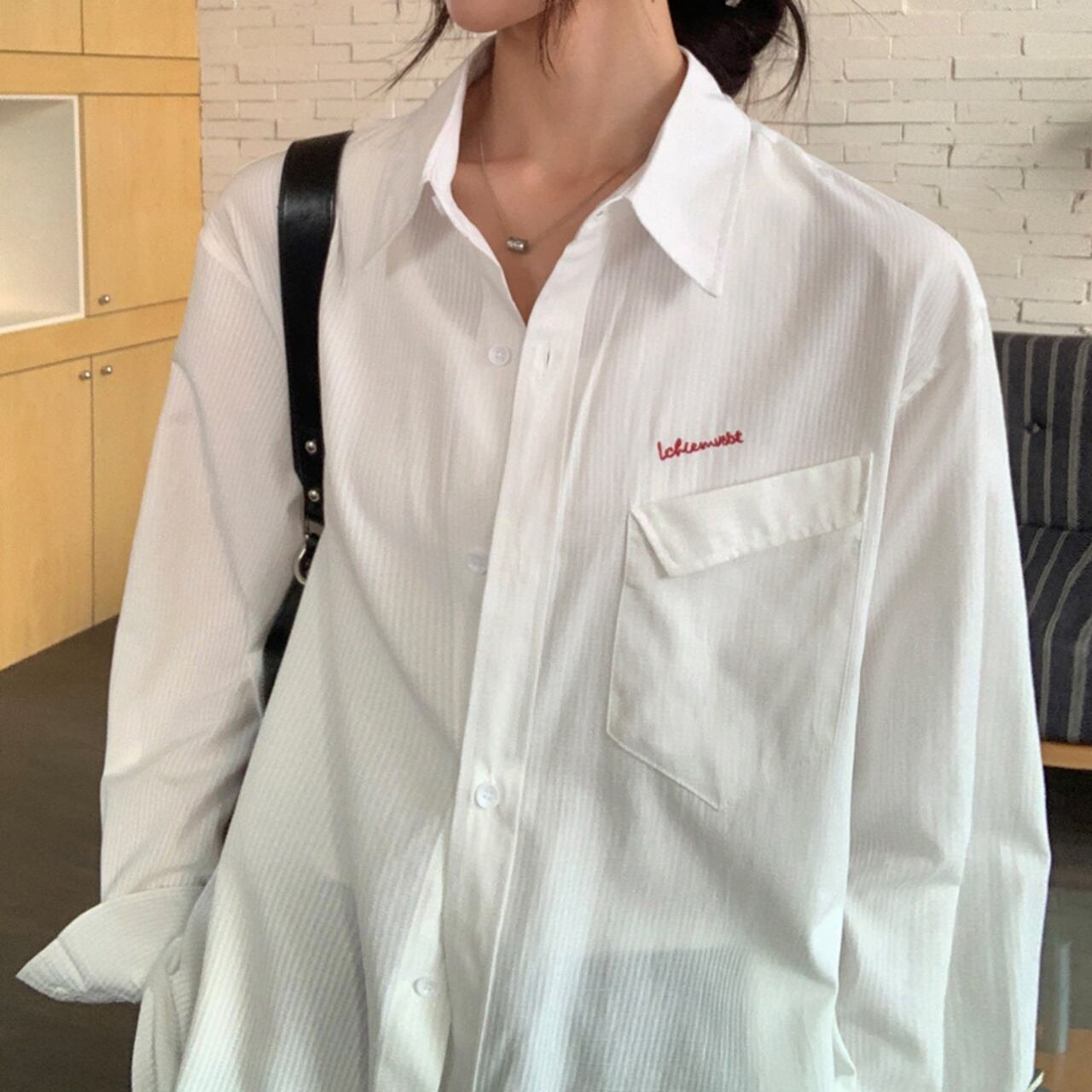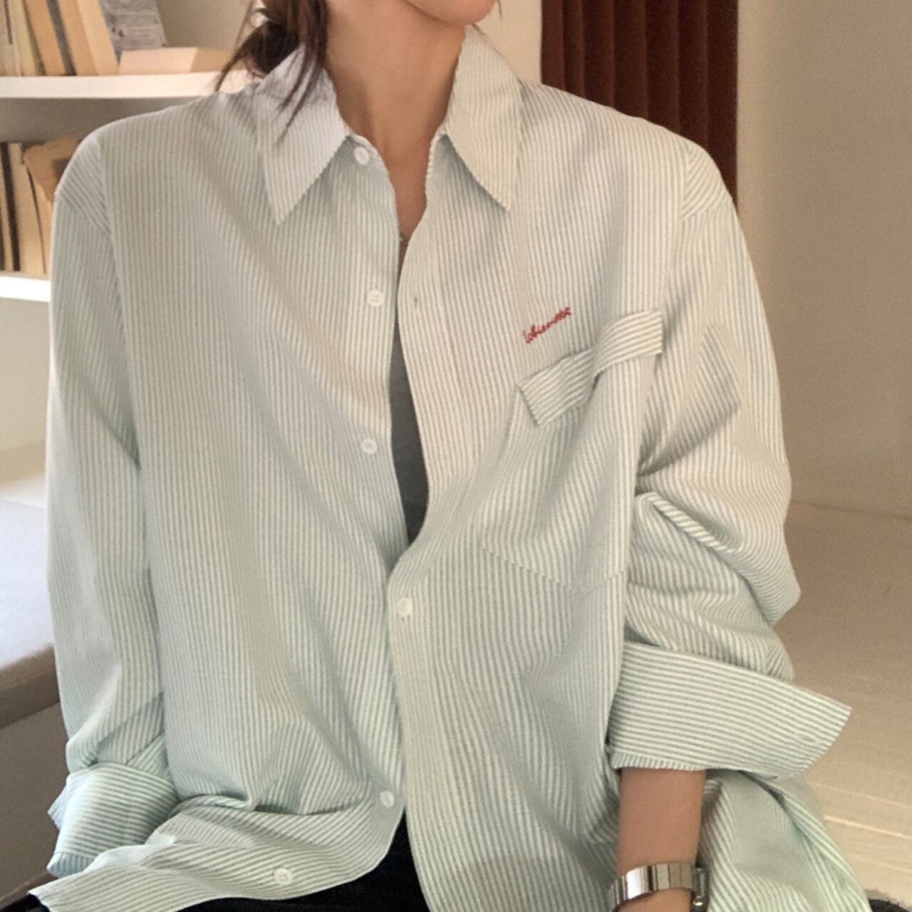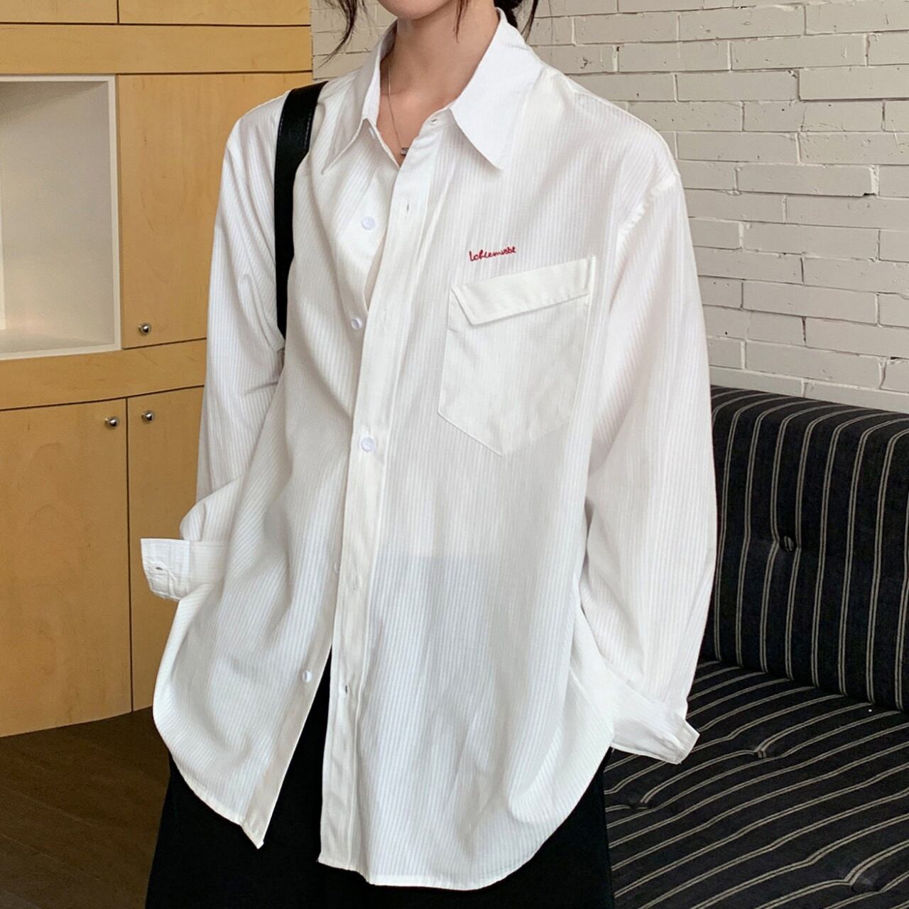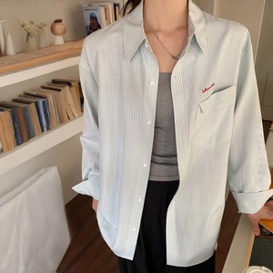 ルーズフィットワンポイントロゴエンブロイダリーストライプシャツ A02113