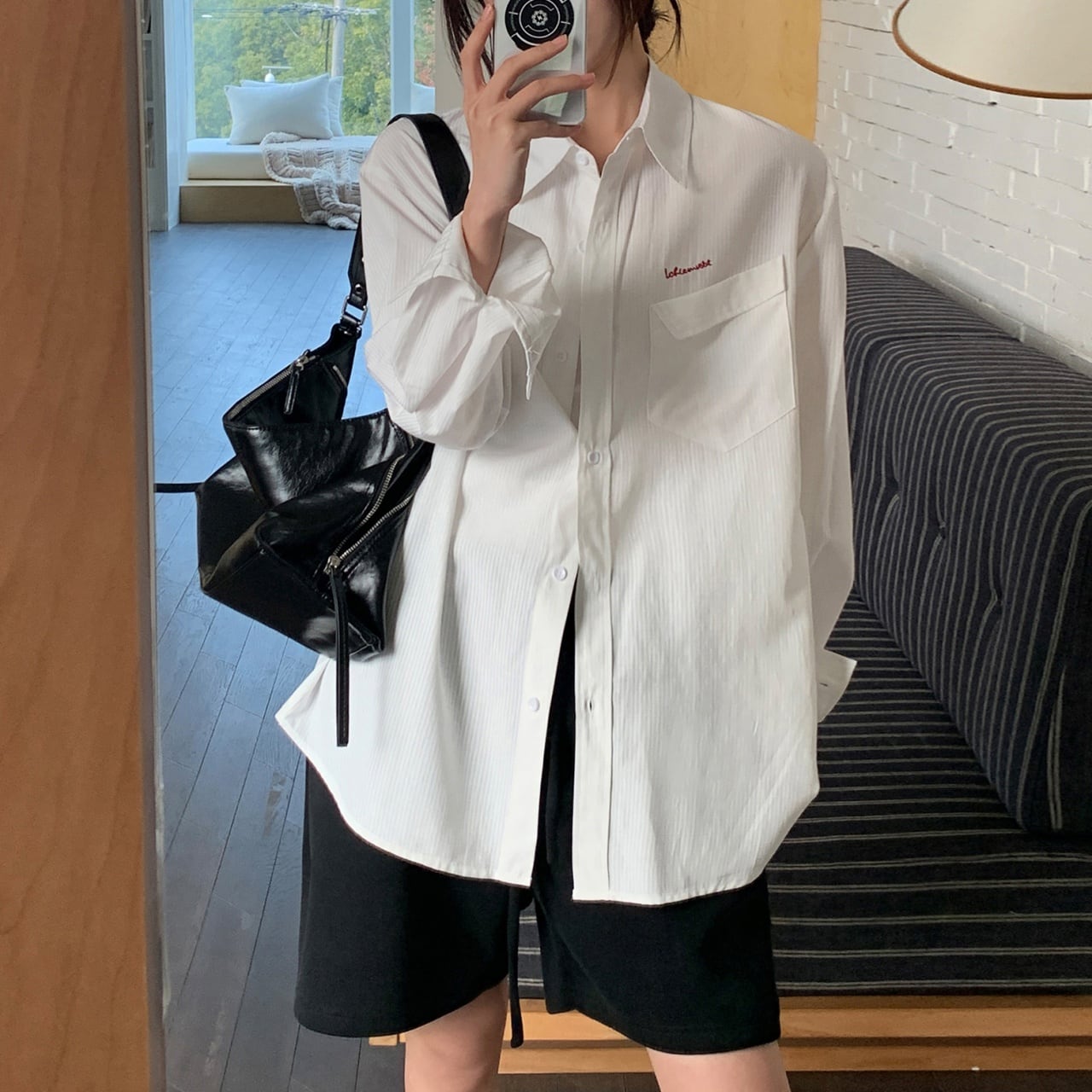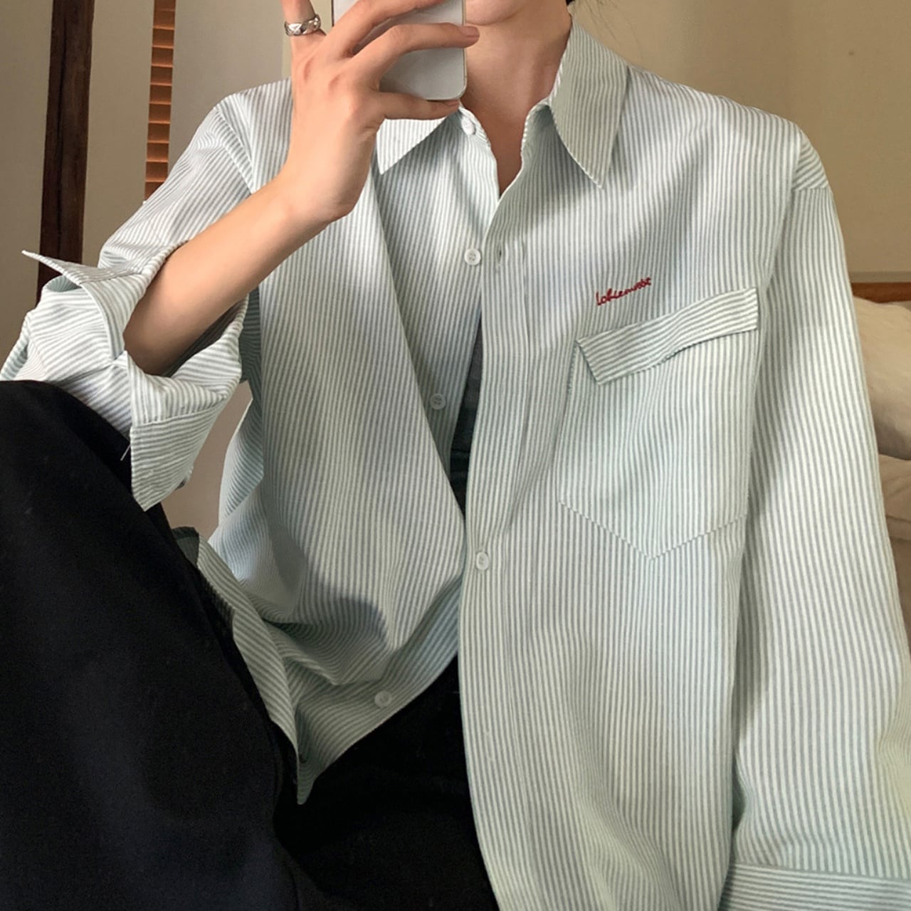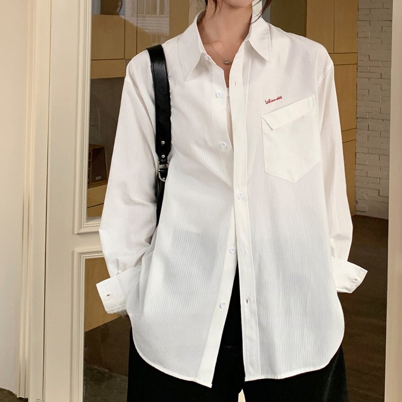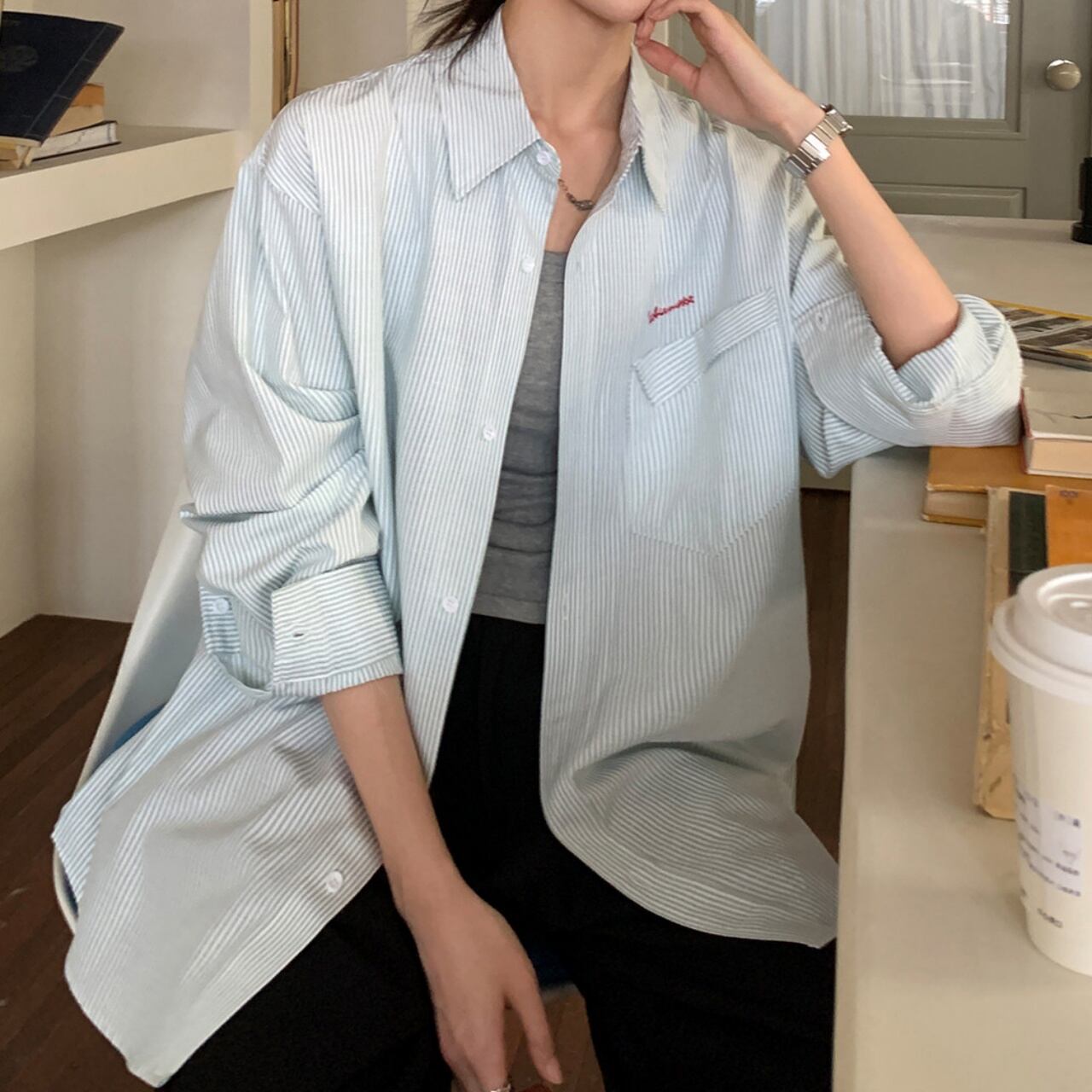 ルーズフィットワンポイントロゴエンブロイダリーストライプシャツ A02113