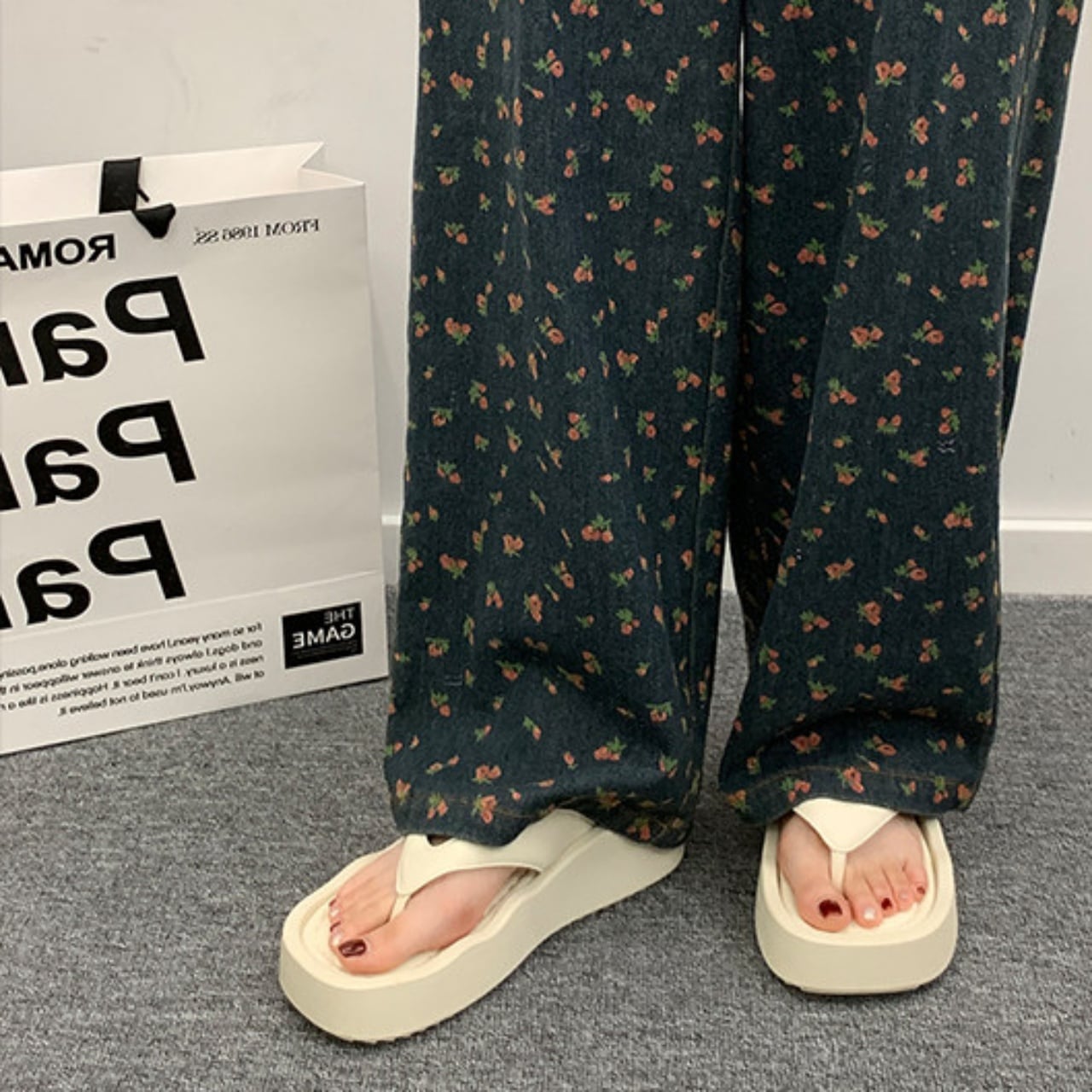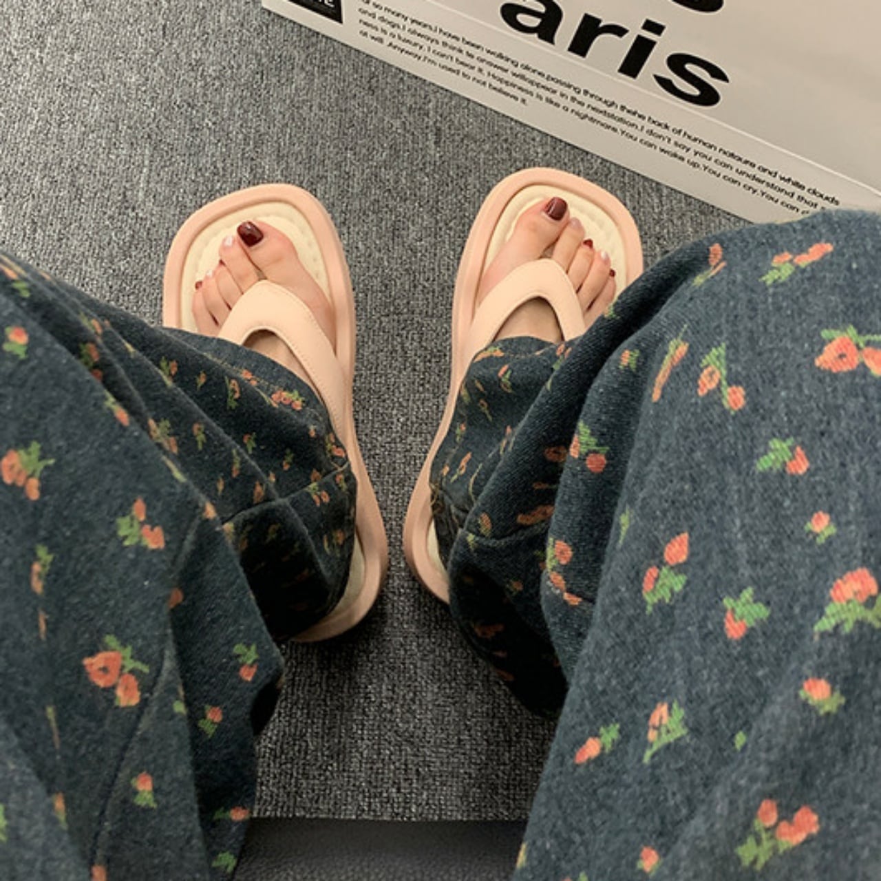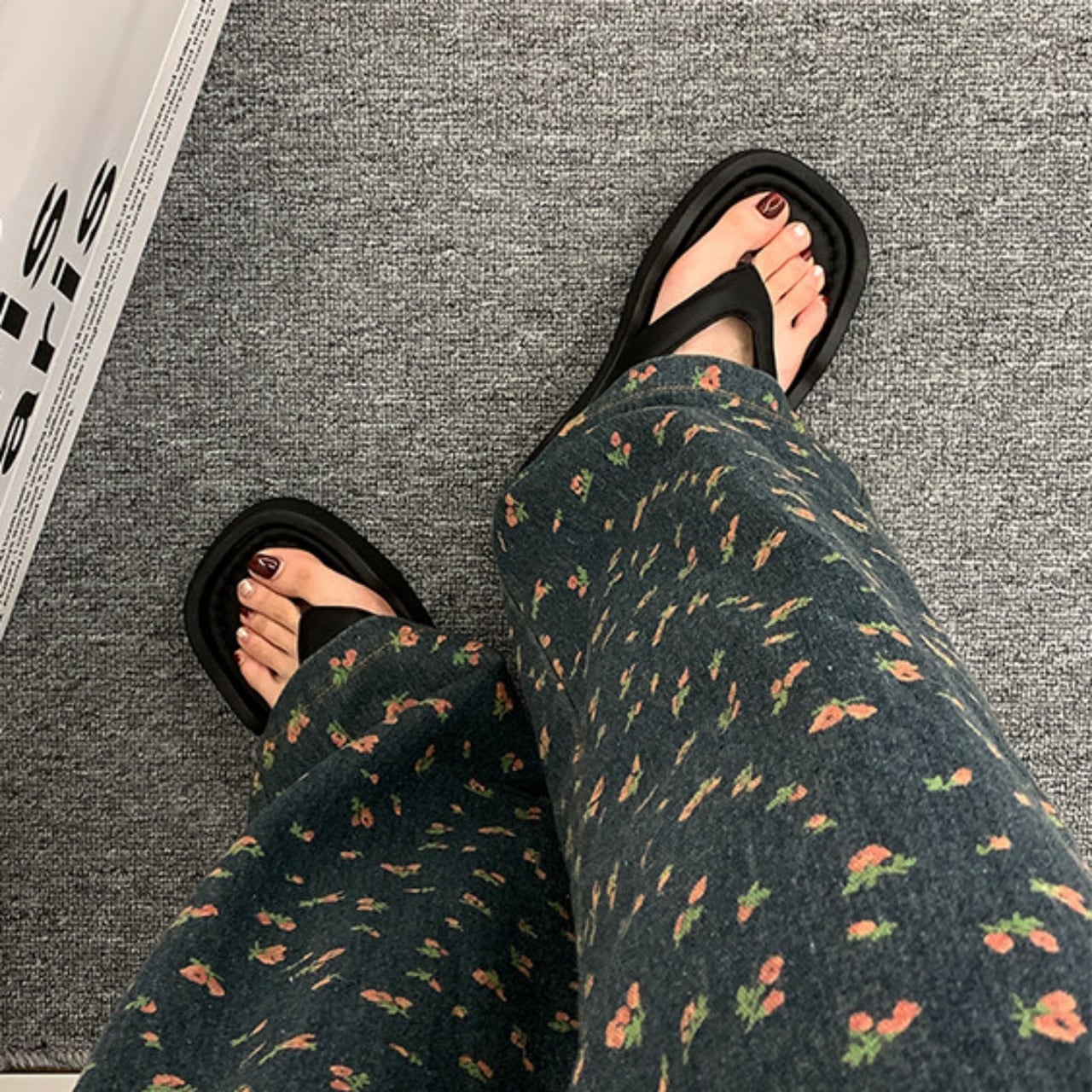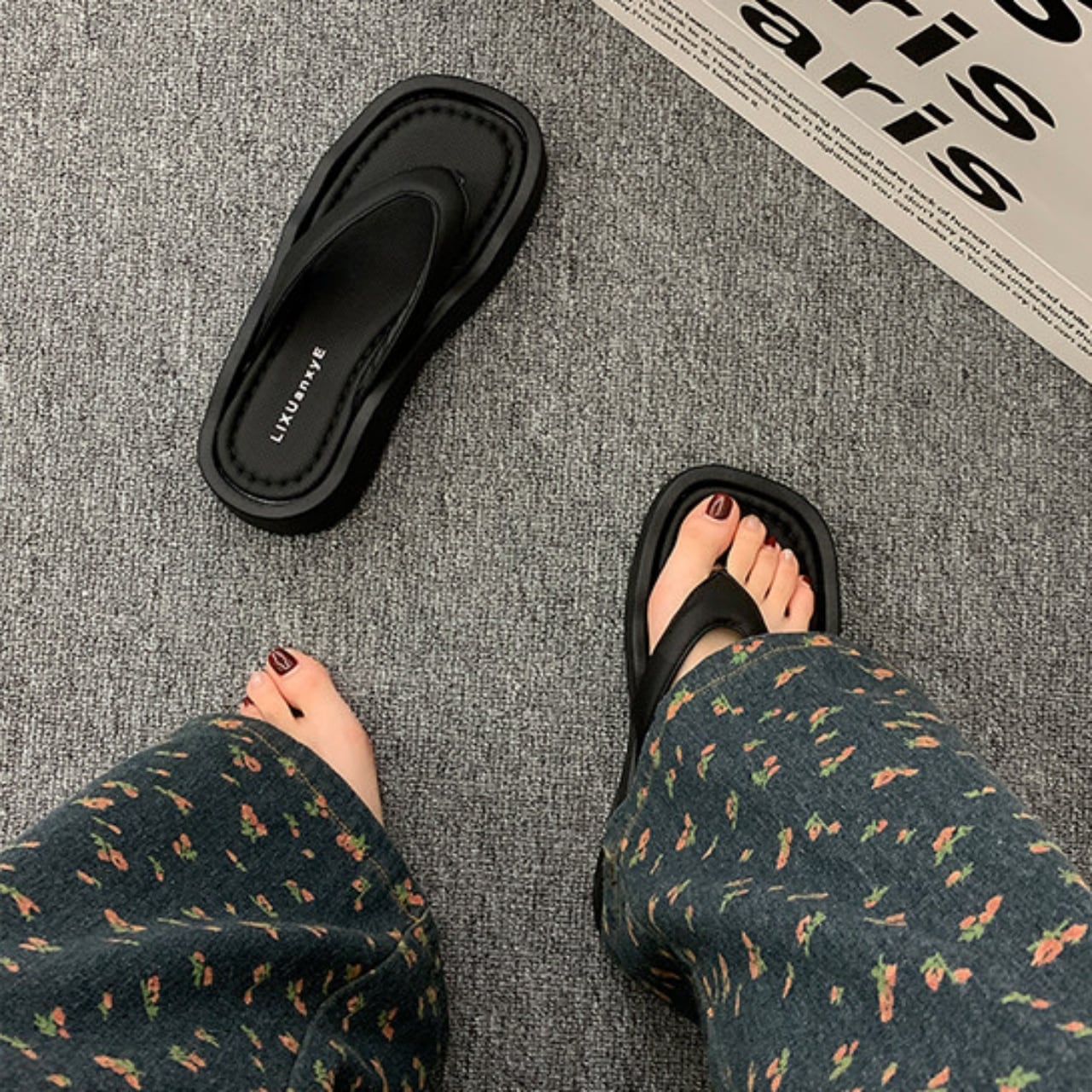 旬のボリュームソールに、波打つようなウェーブを効かせたトングサンダル。