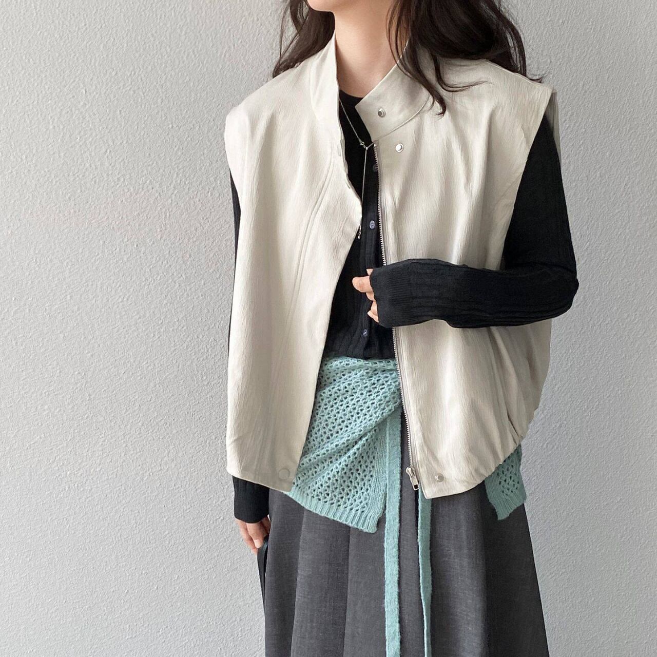 顔周りをシャープに見せるスタンドカラーがスタイリッシュなベスト。
