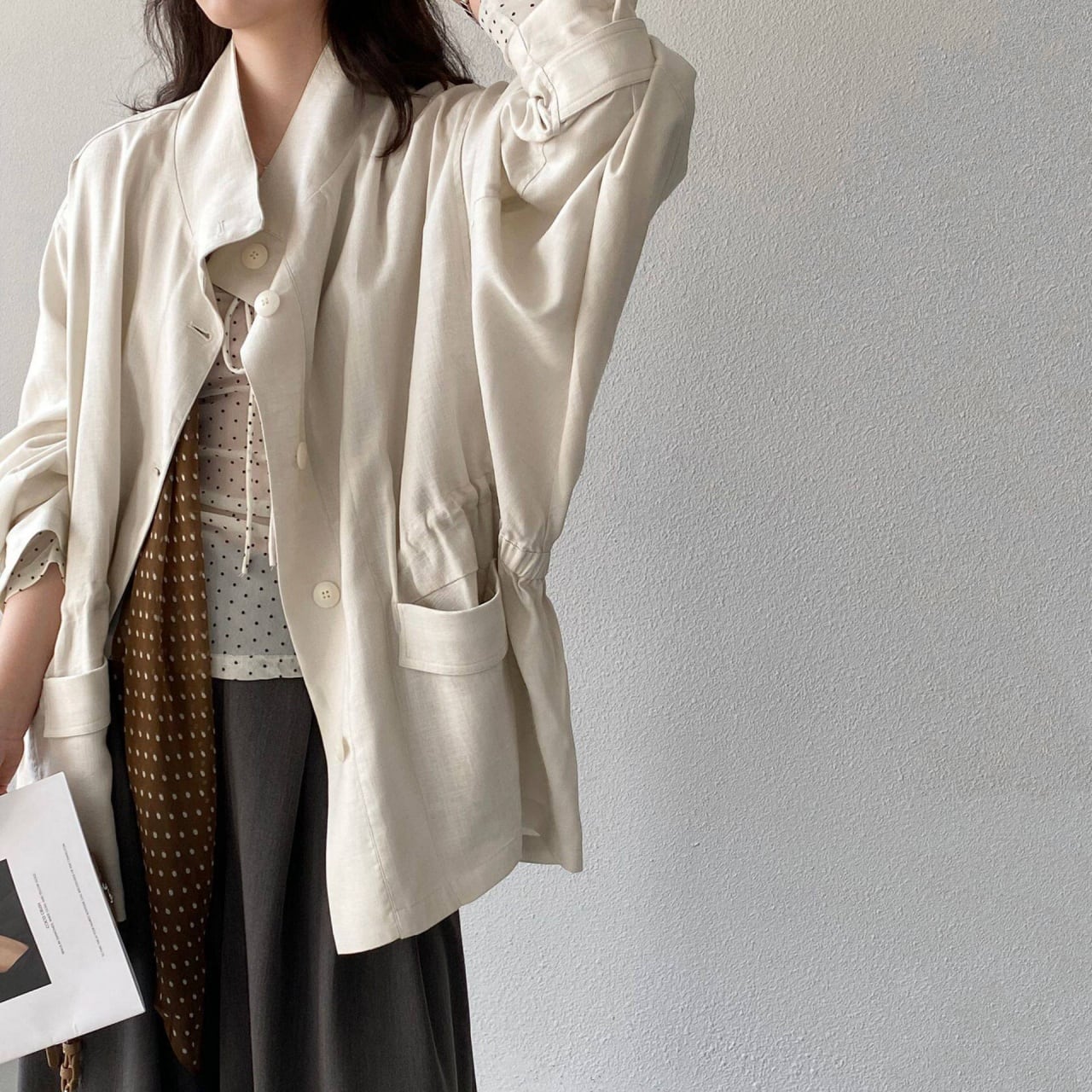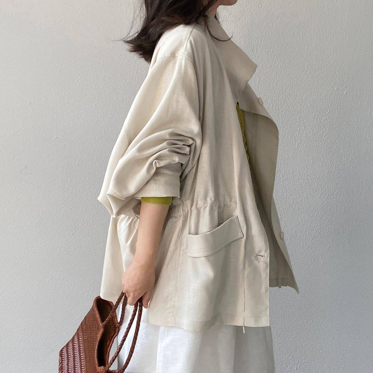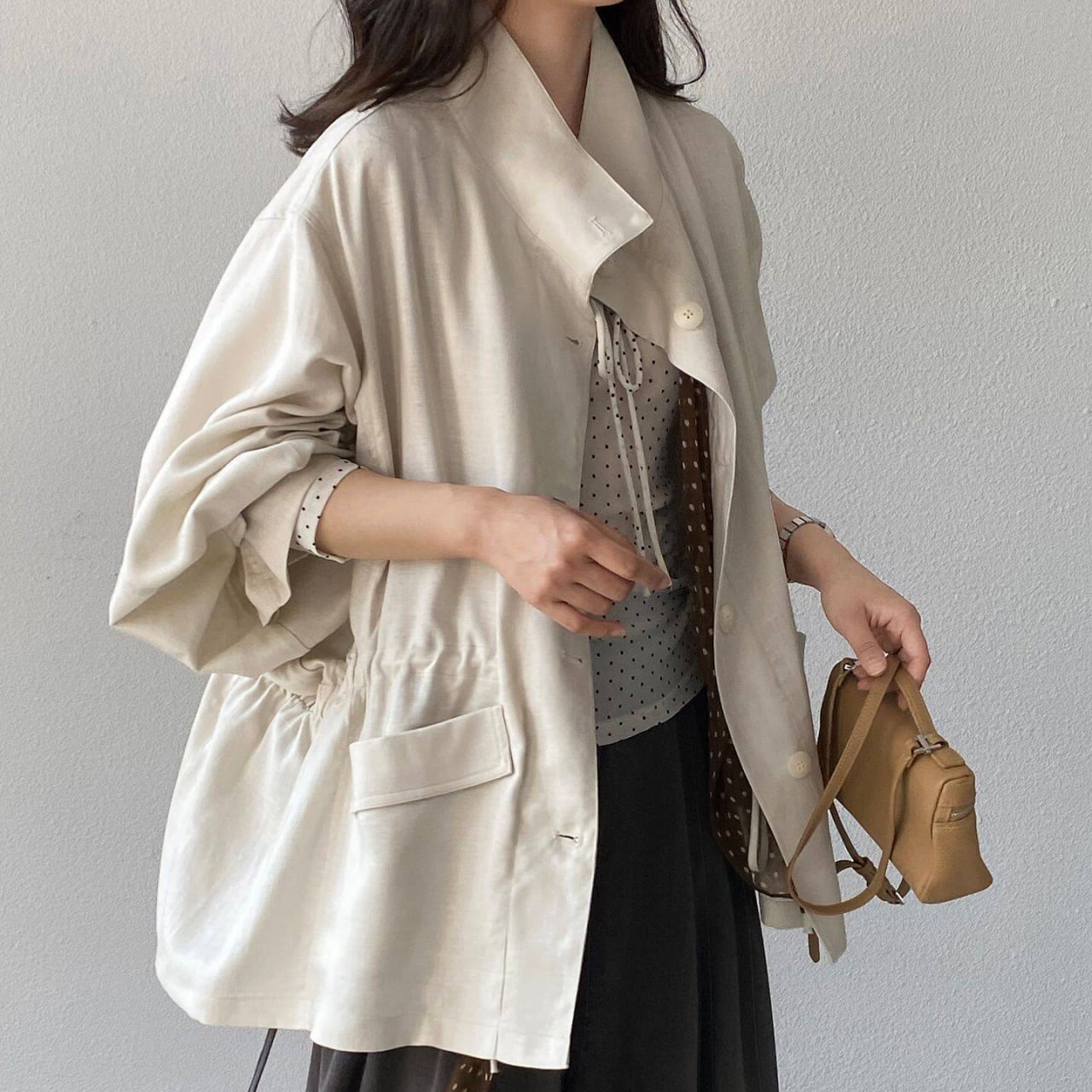 ウエストのドローストリングでシルエットにメリハリをつけ、スタイルアップ効果を叶えます。