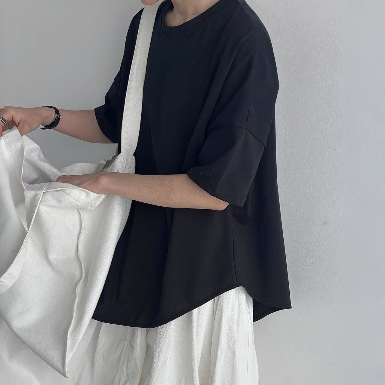 着るだけでこなれた印象に仕上がるアシメヘムTシャツ。