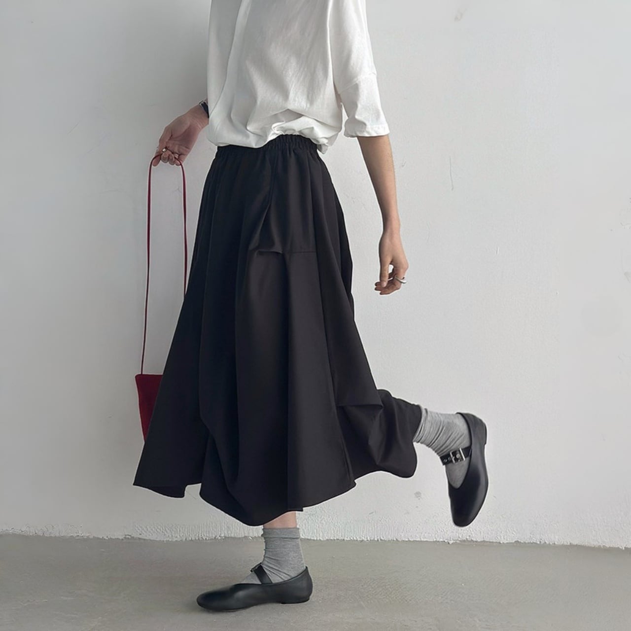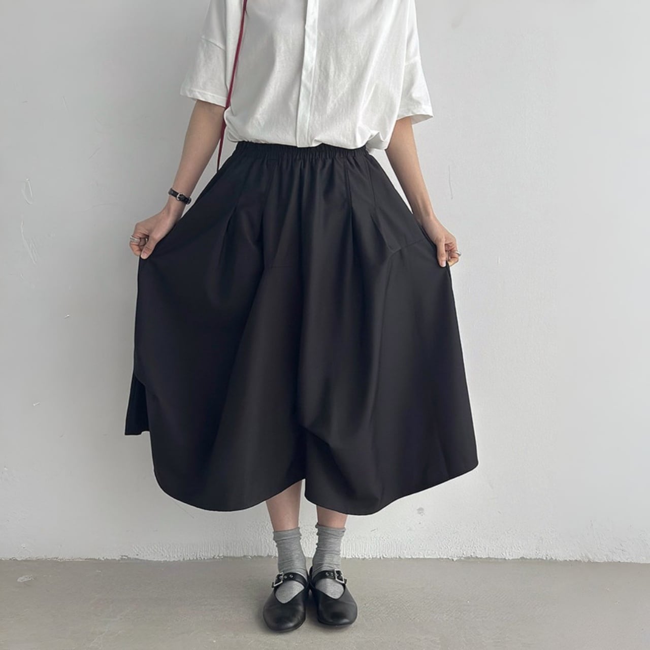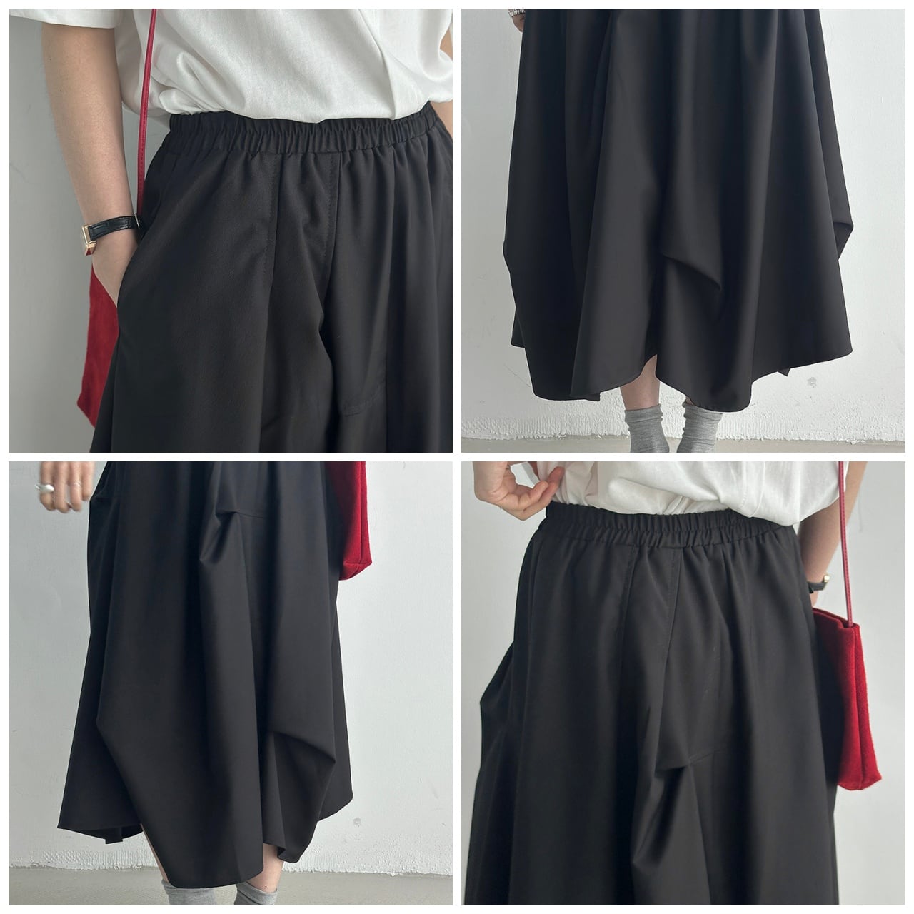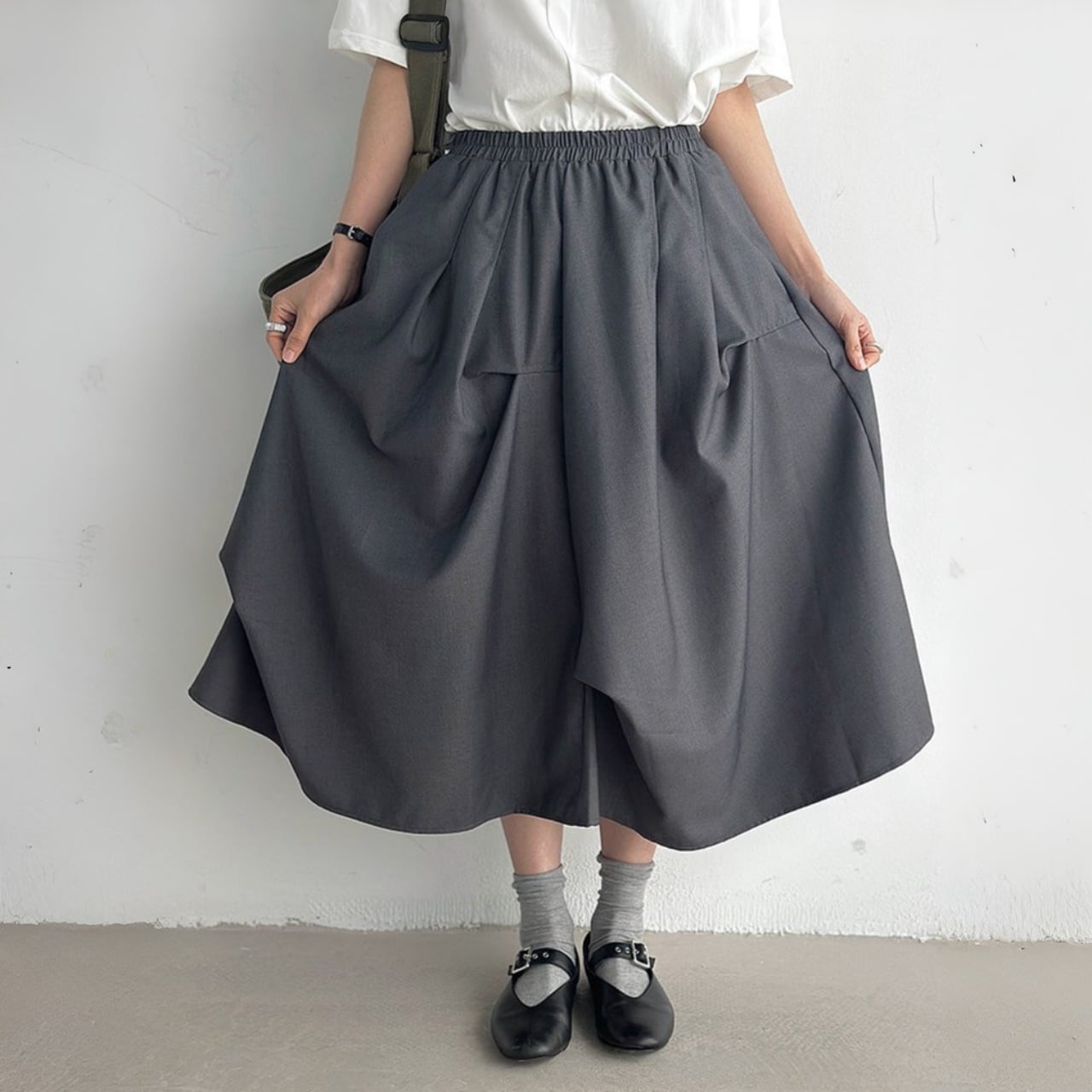 動くたびに表情が変わる、ランダムタックが印象的なスカート。