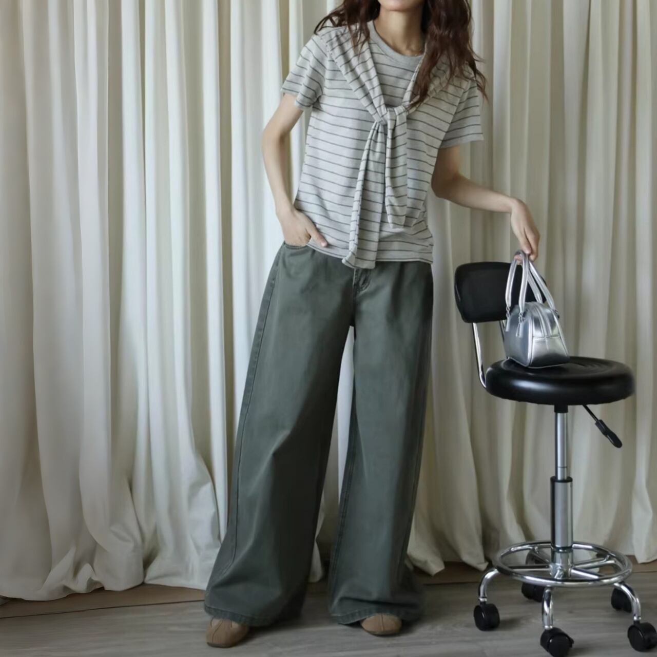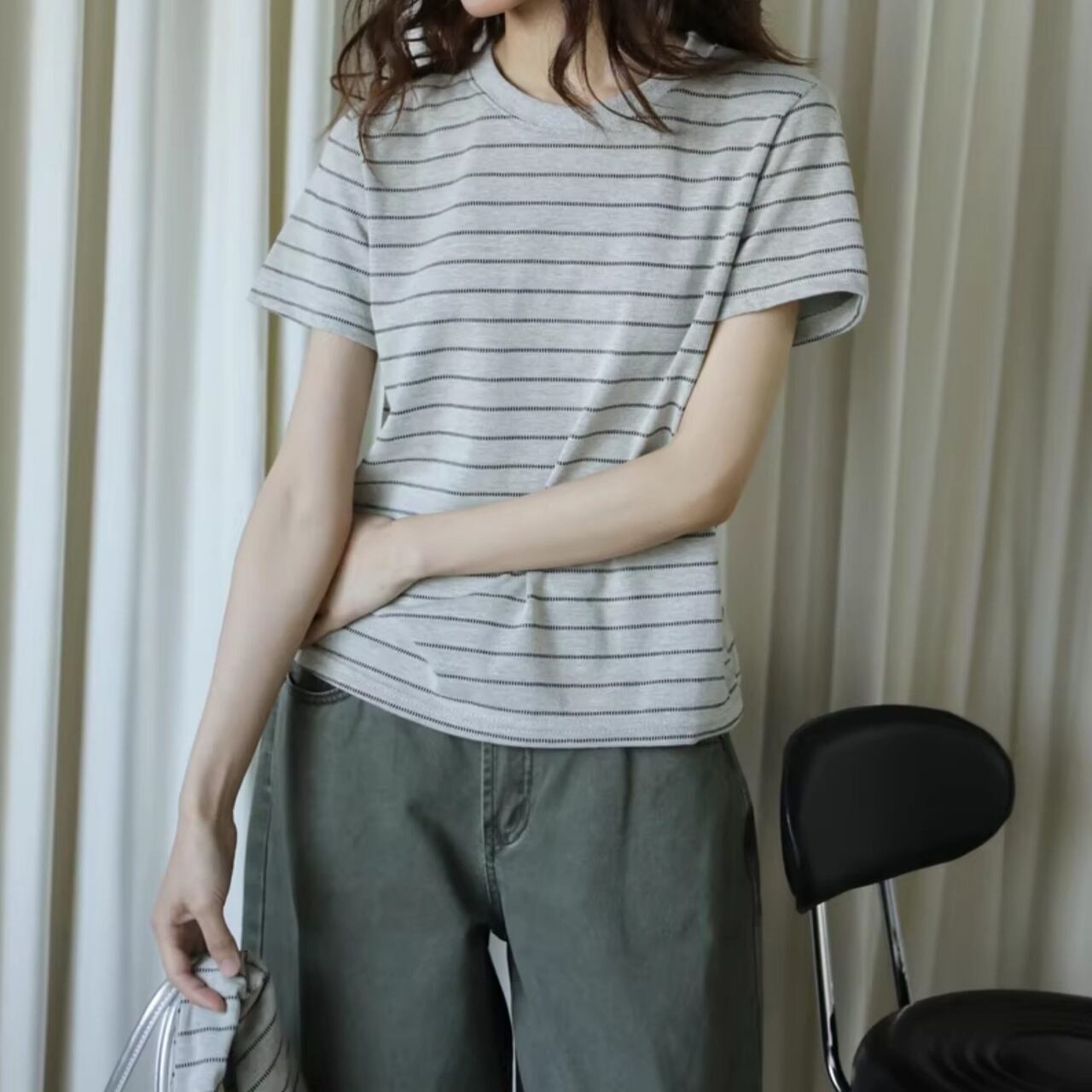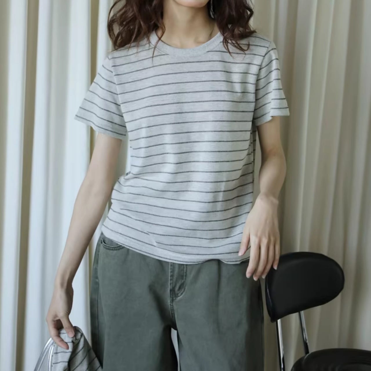 細めのボーダーでカジュアルになりすぎず、上半身をすっきり見せてくれます。