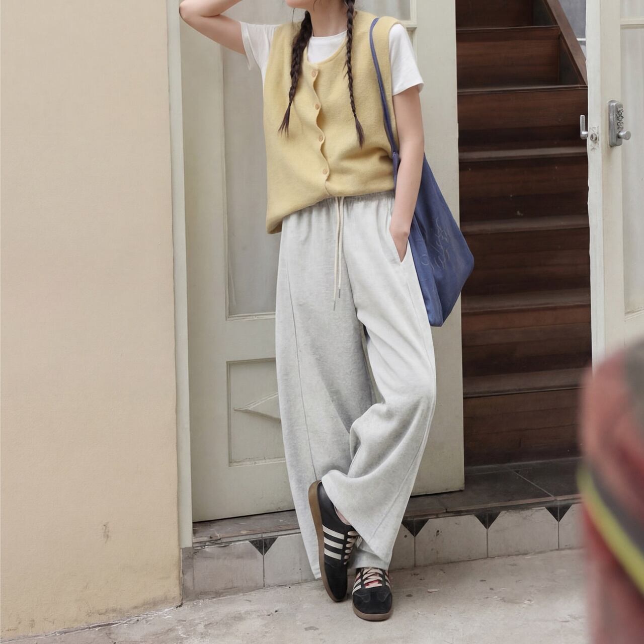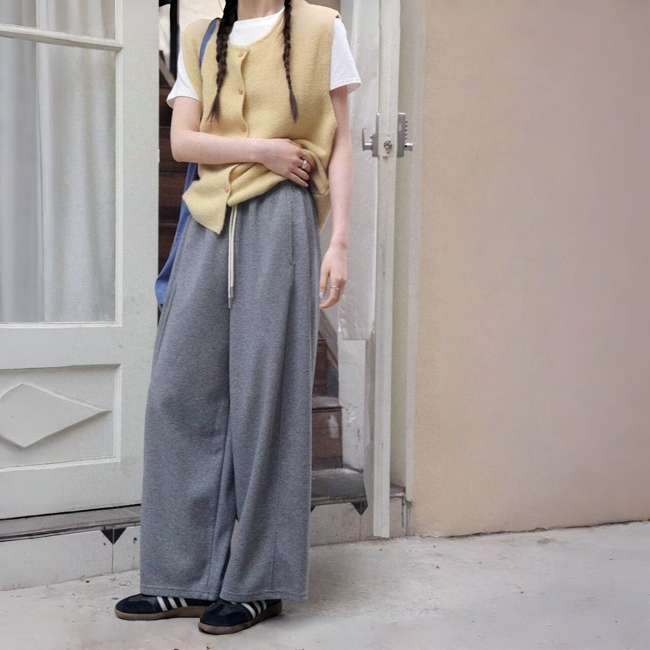 センターシームがアクセントのワイドパンツ。