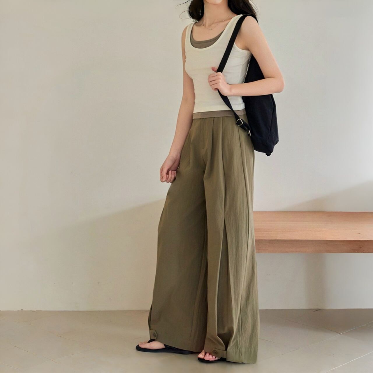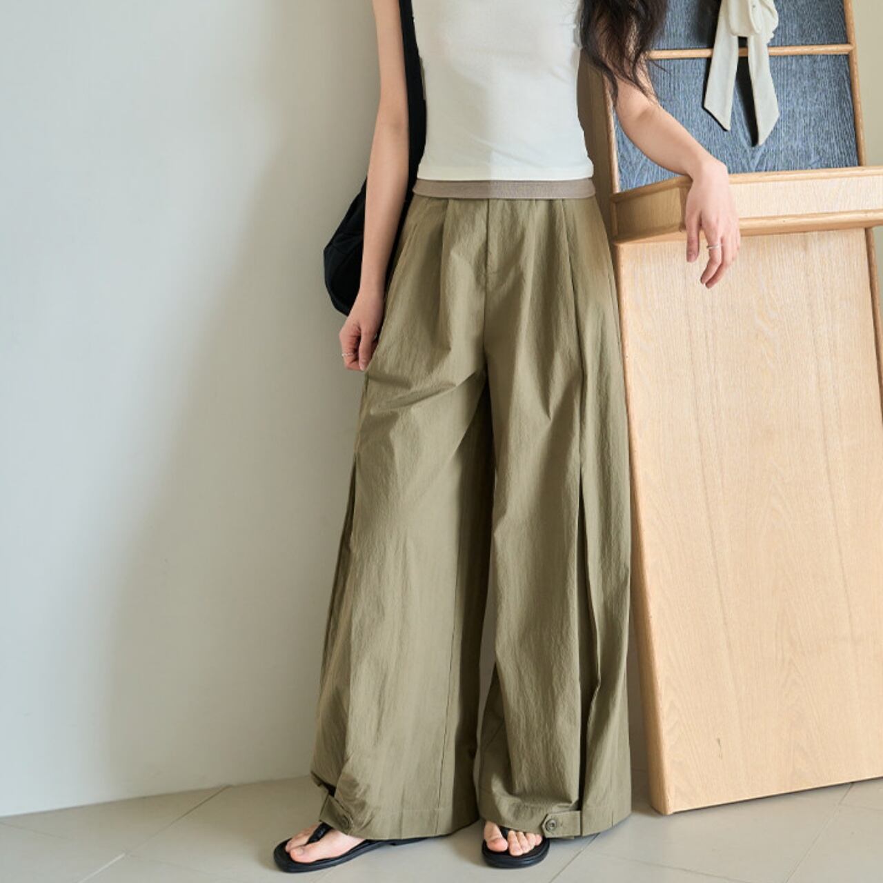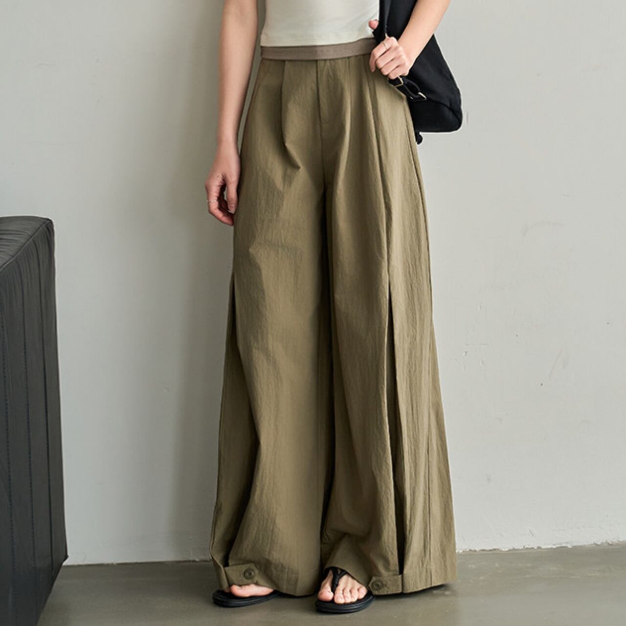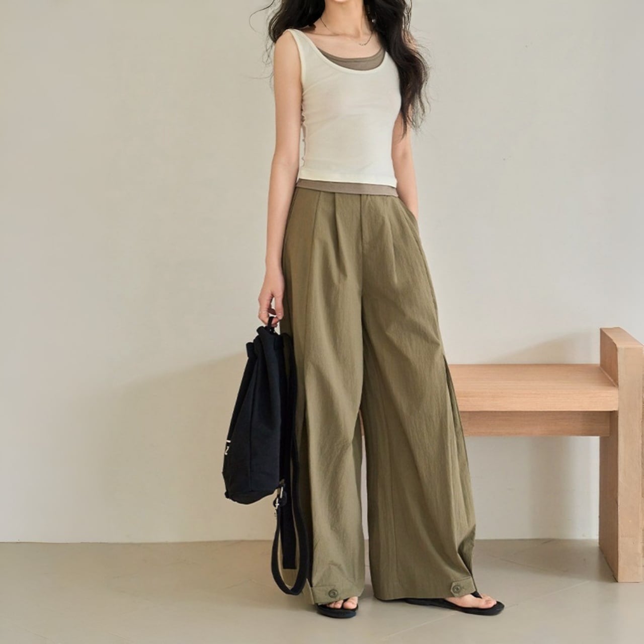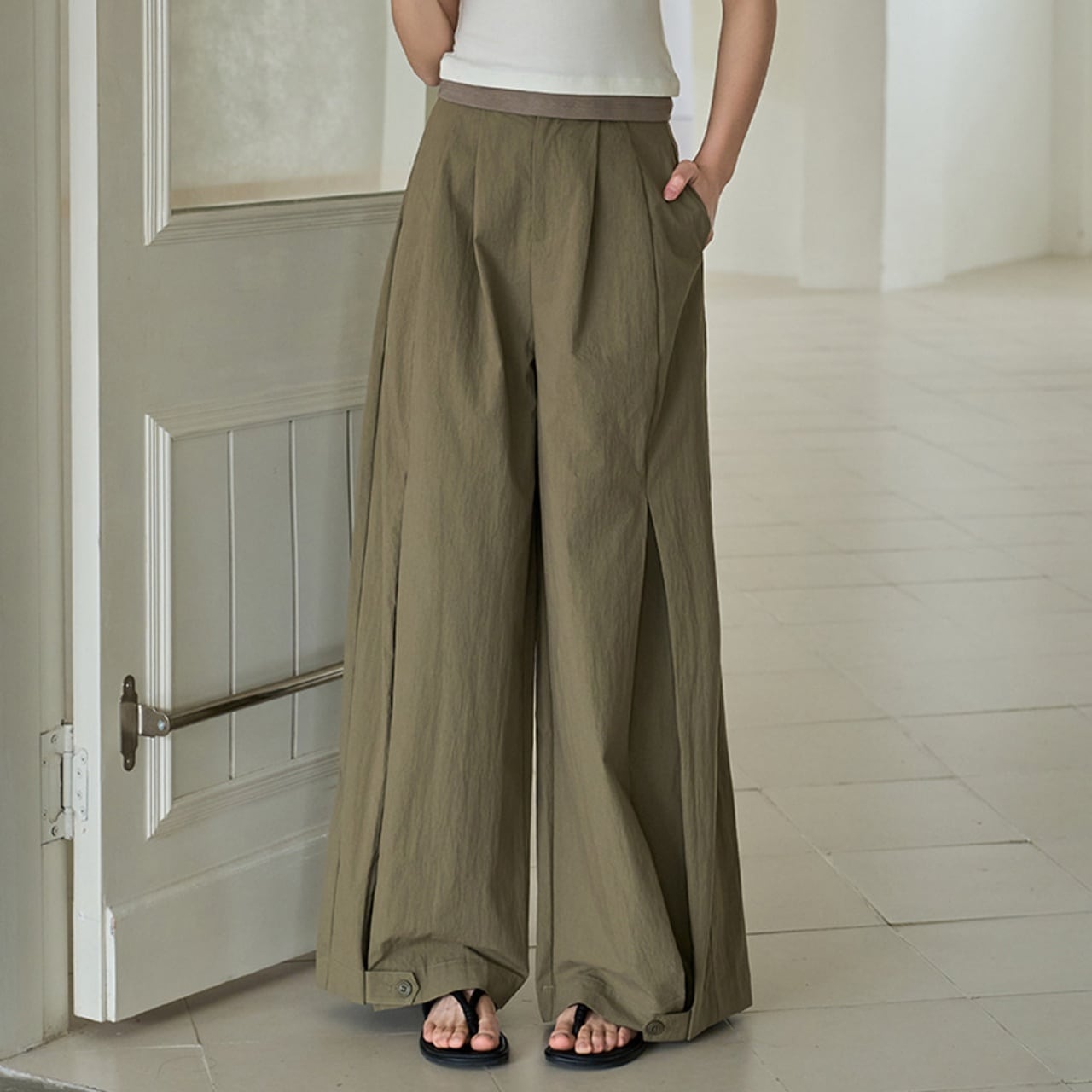 裾のボタンタブが、ワイドシルエットにさりげないアクセントをプラス。