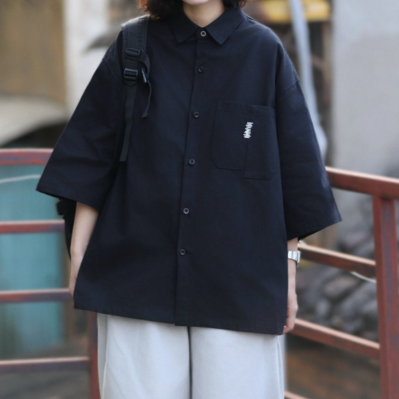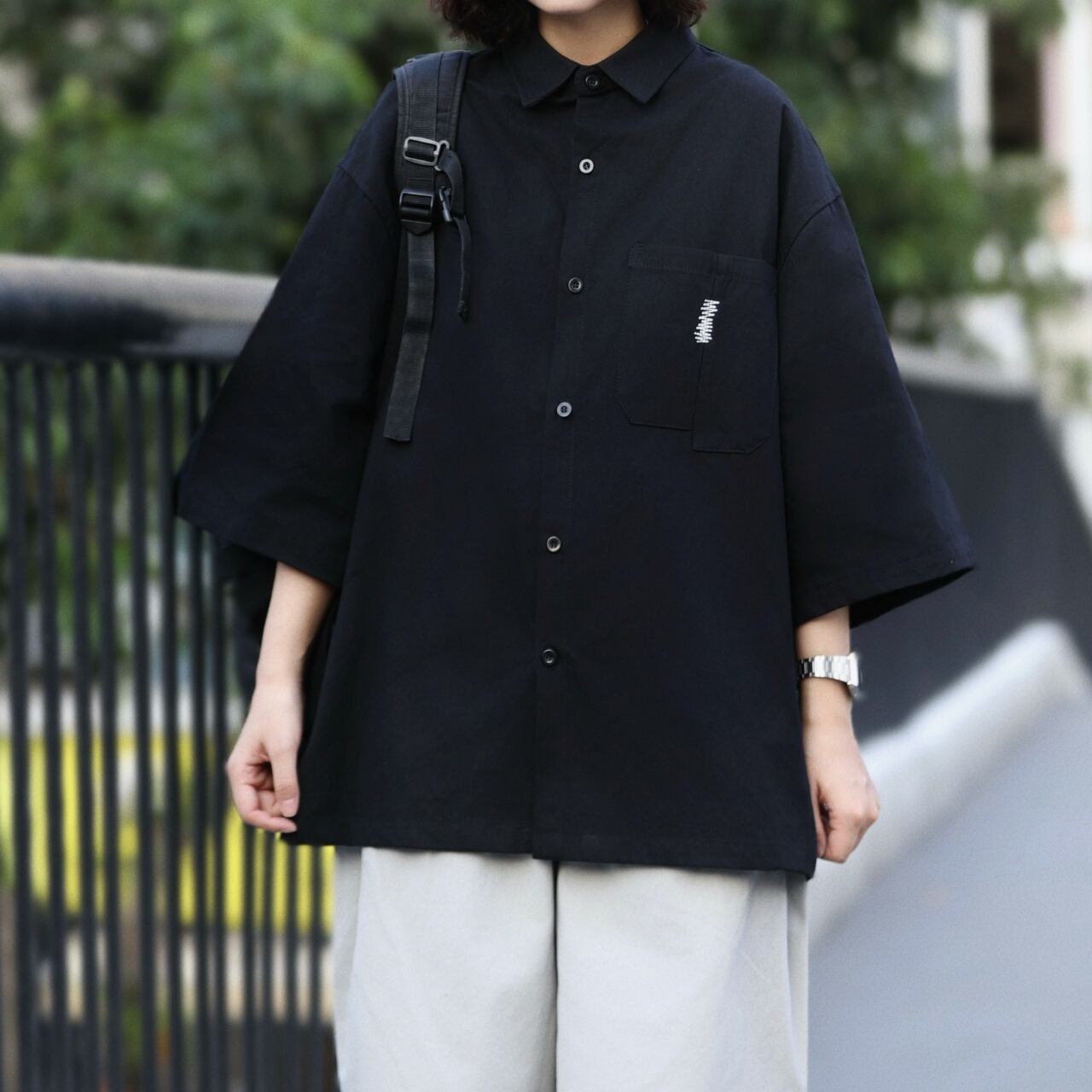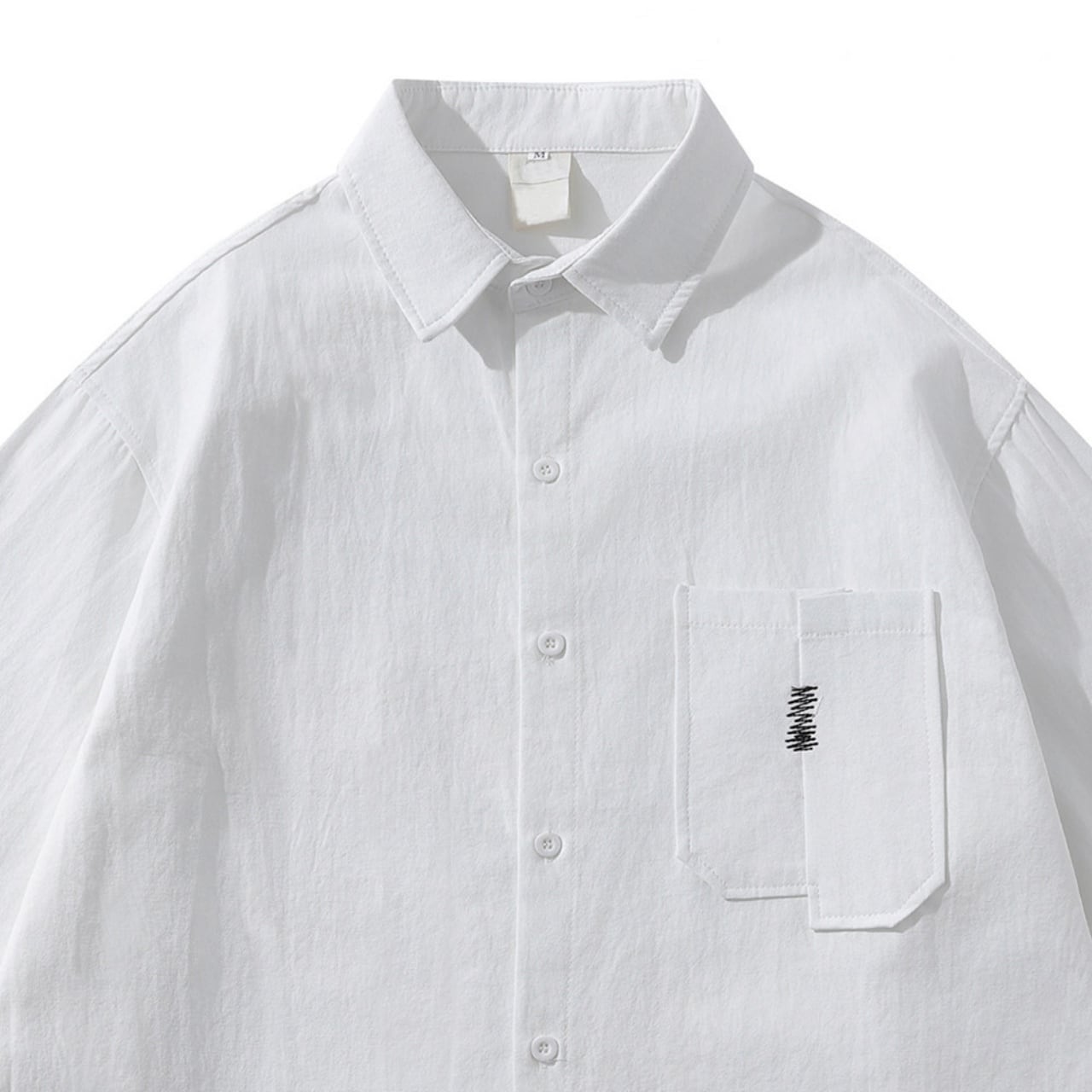 ジグザグステッチアシンメトリーポケットユニセックスシャツ A02174