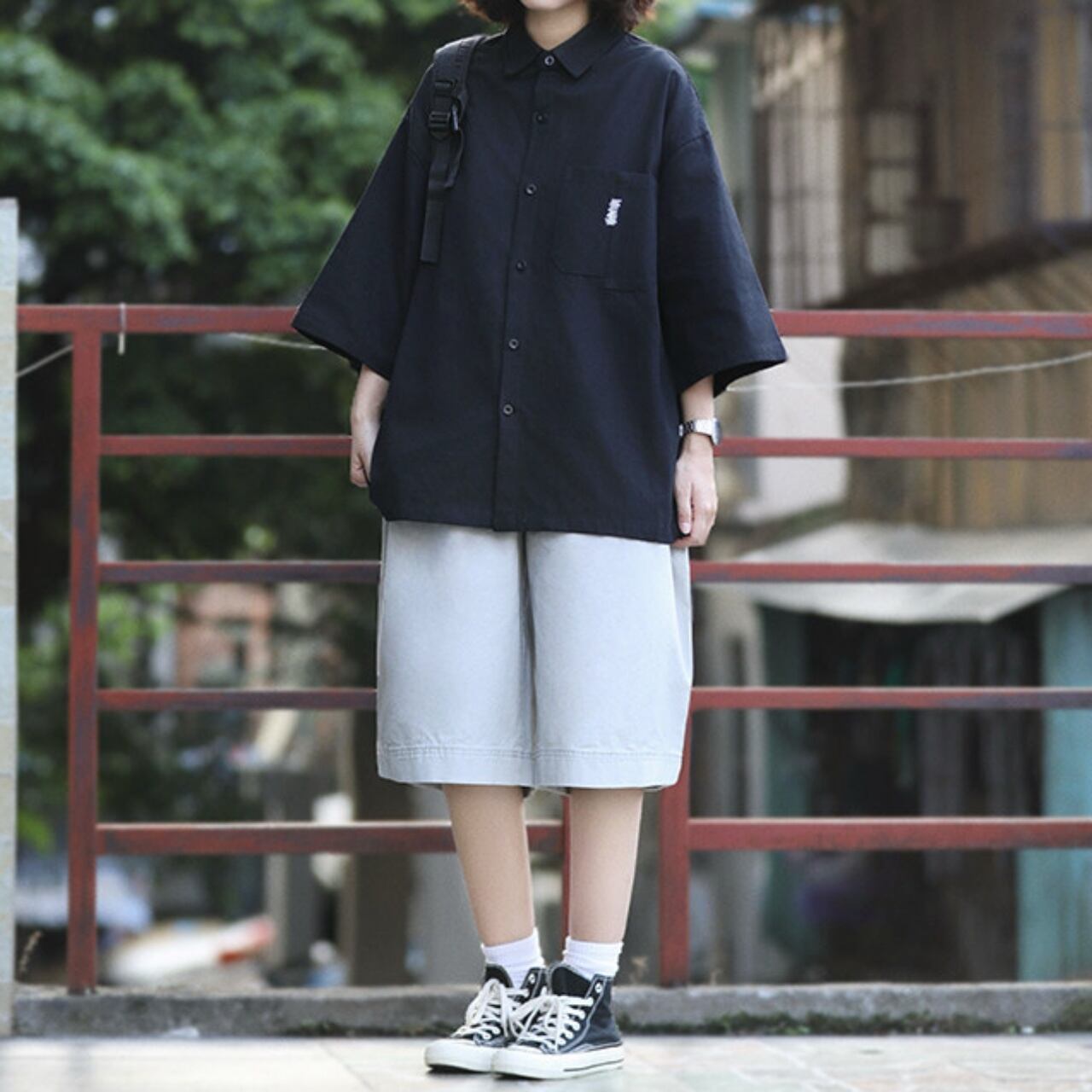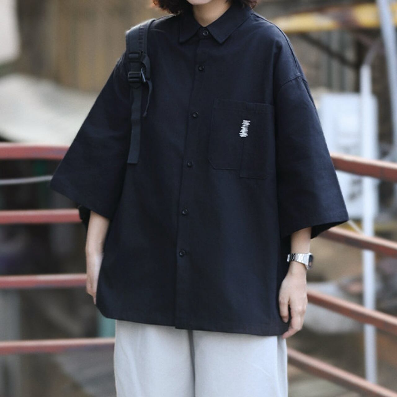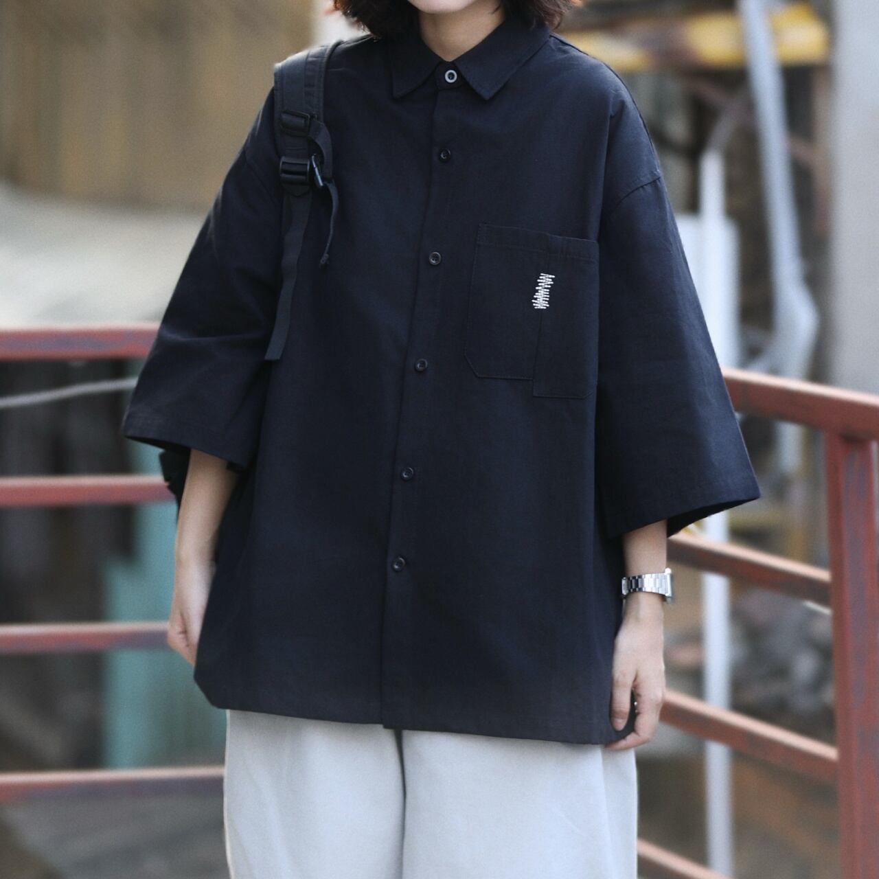 ジグザグステッチアシンメトリーポケットユニセックスシャツ A02174