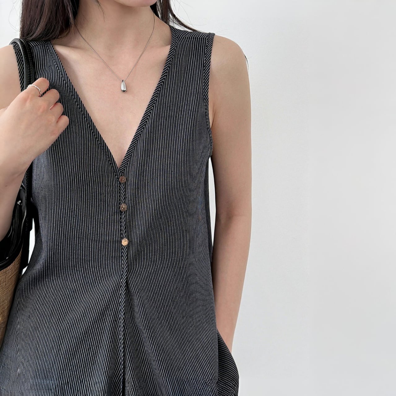 深めのVネックとノースリーブのシャープなラインが女性らしさを際立たせます。