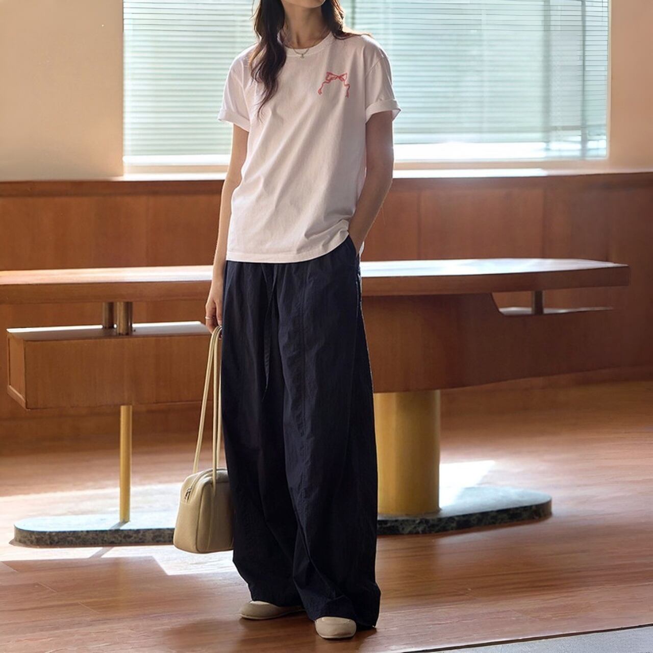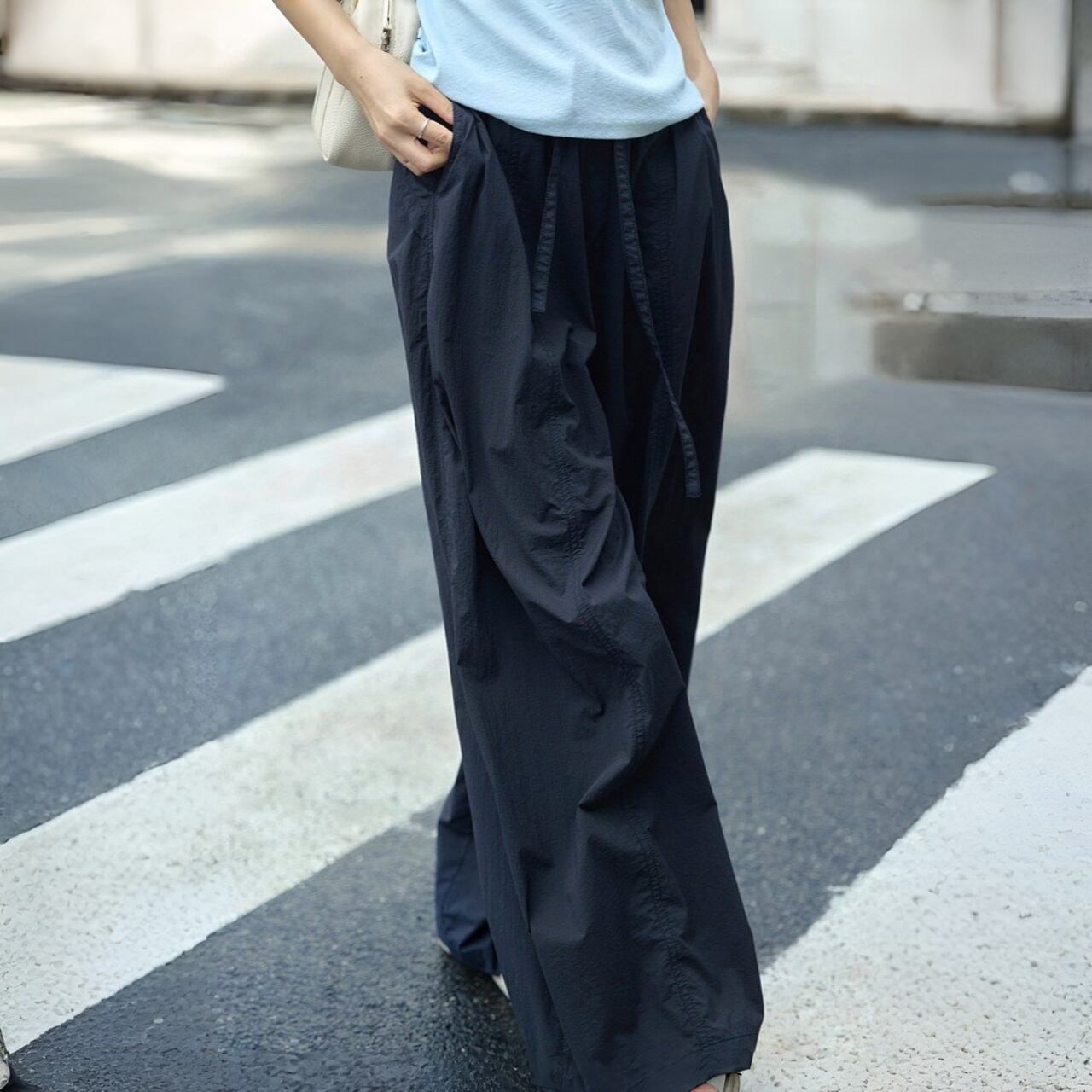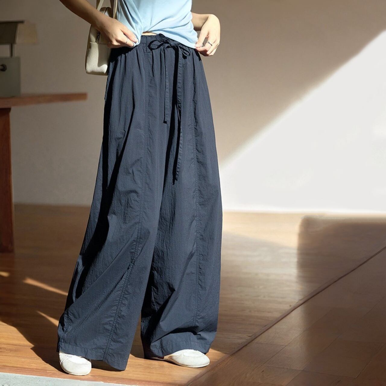 ウエストはゴム仕様+ドローストリング付きで、リラックス感のある着心地。