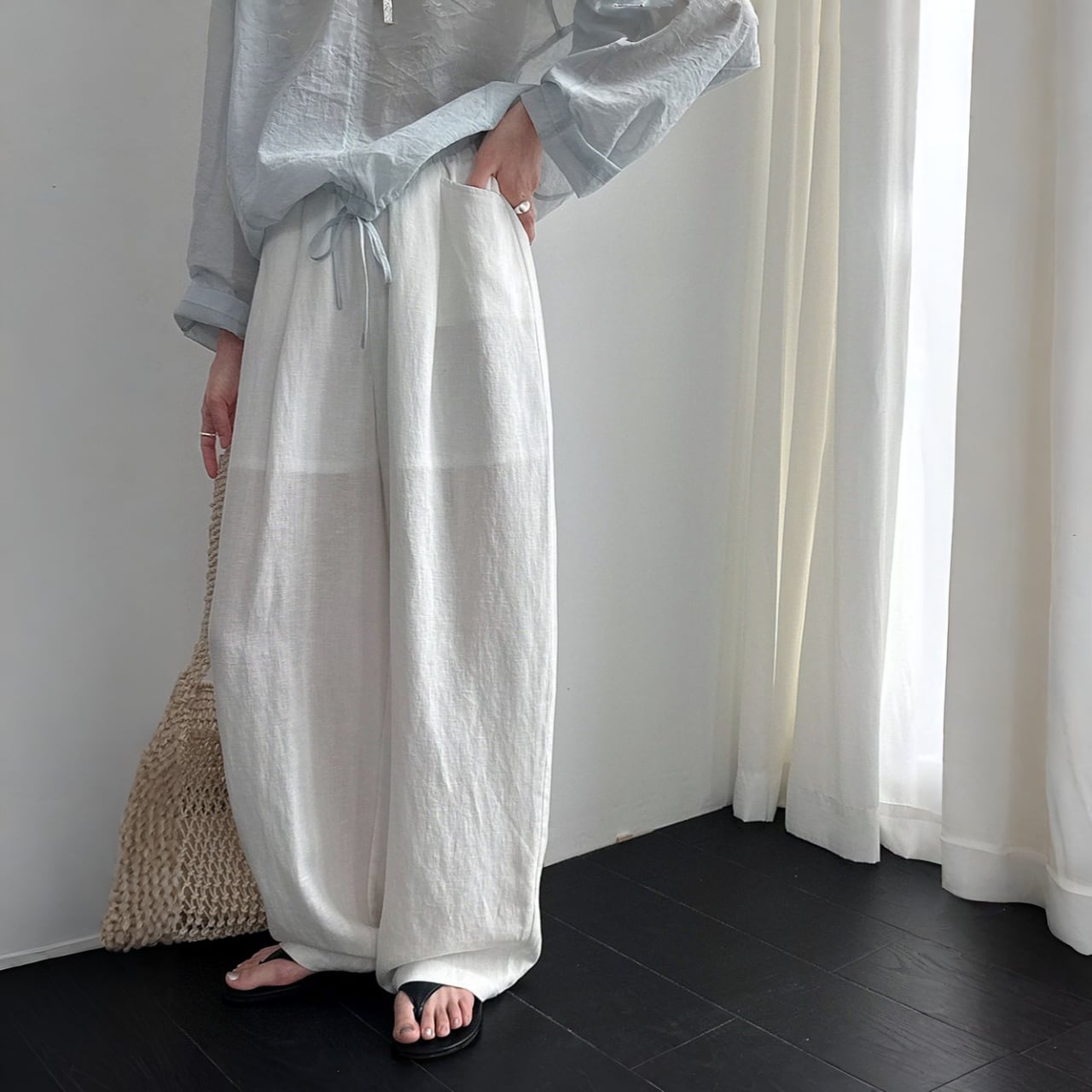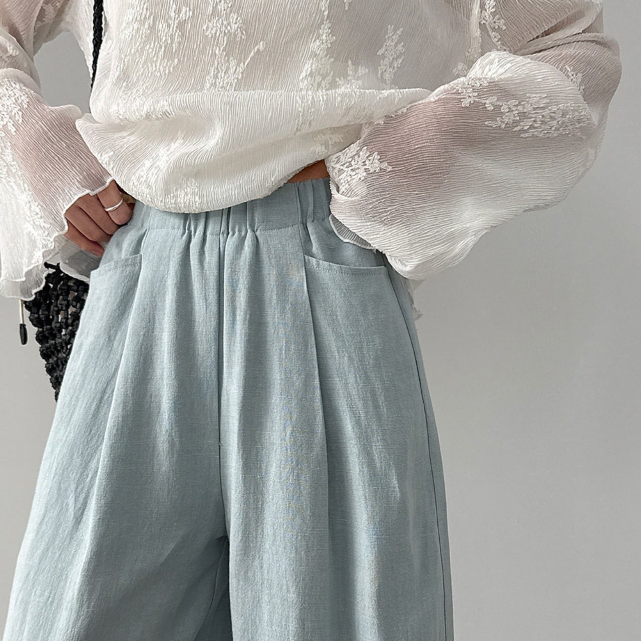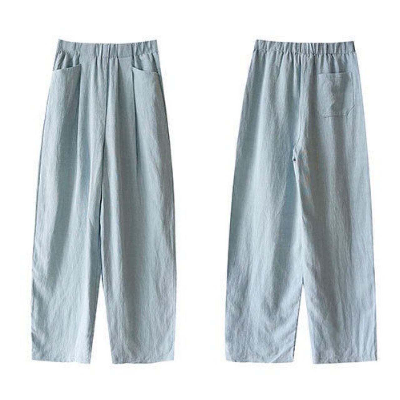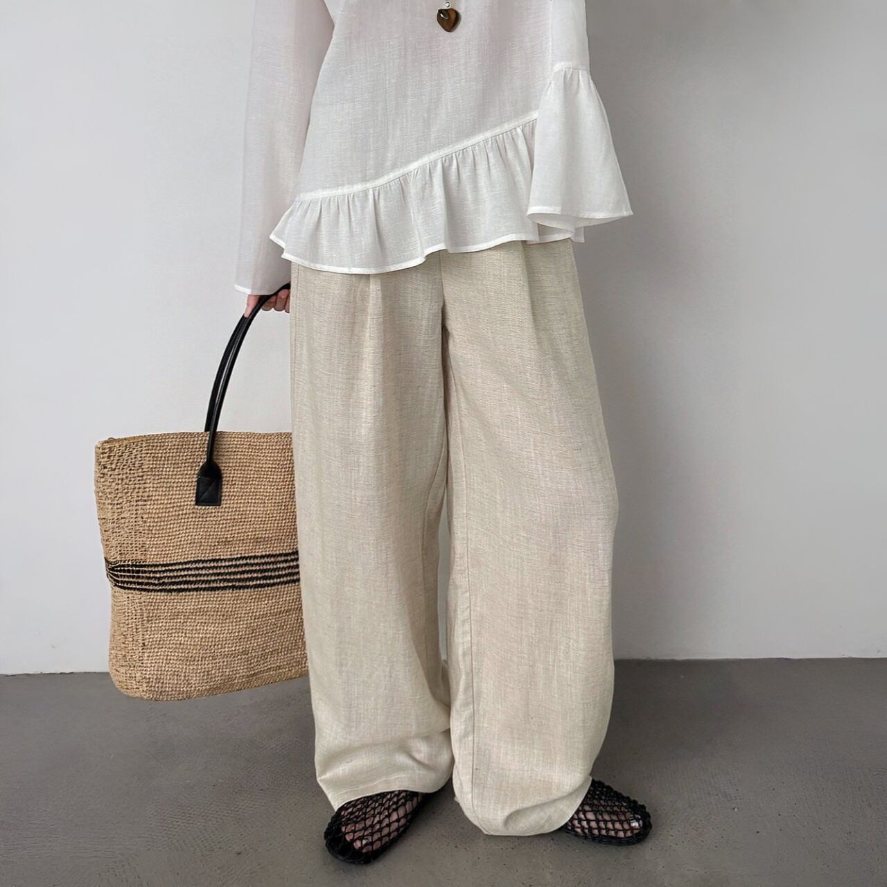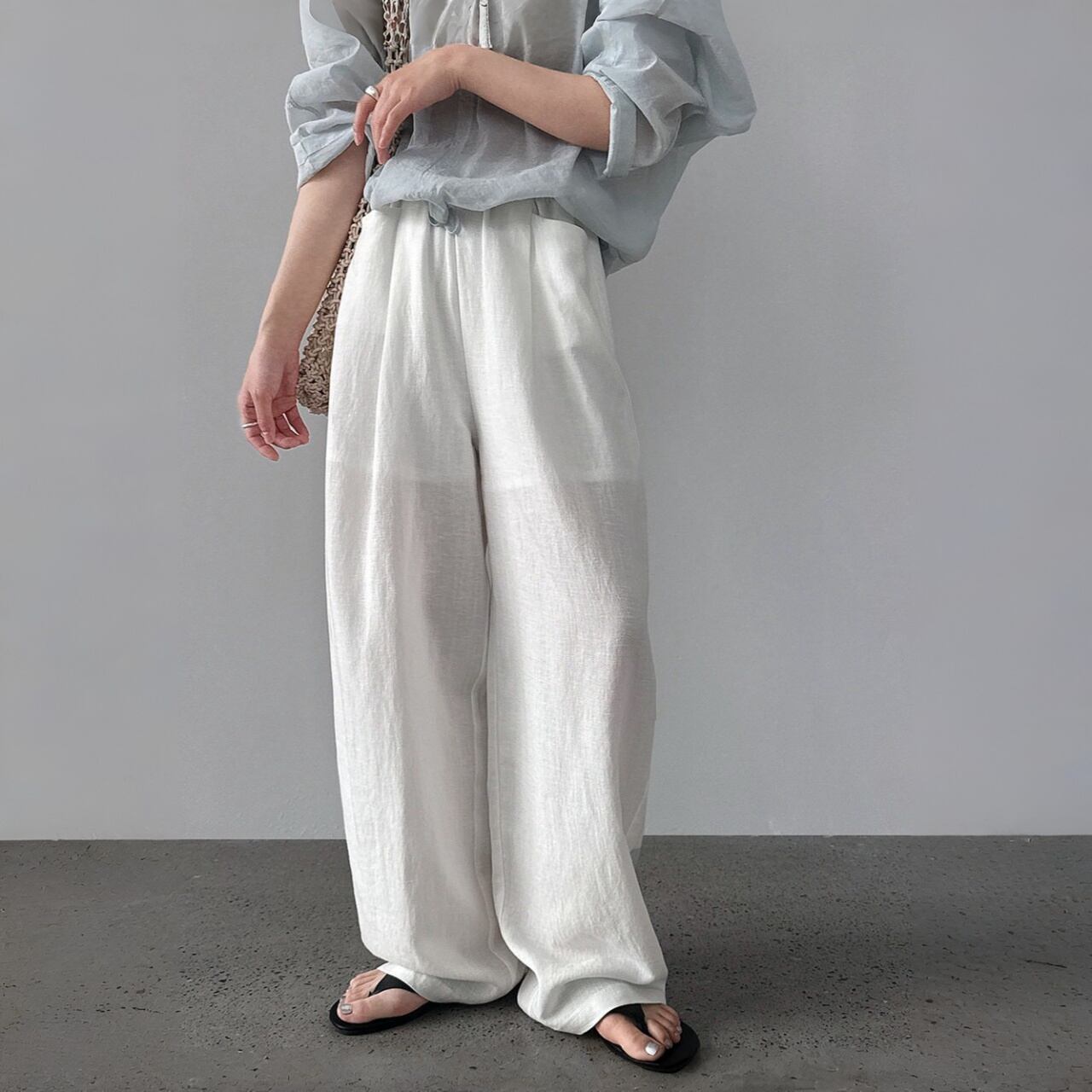 軽やかさと通気性が魅力のリネンブレンドパンツ。