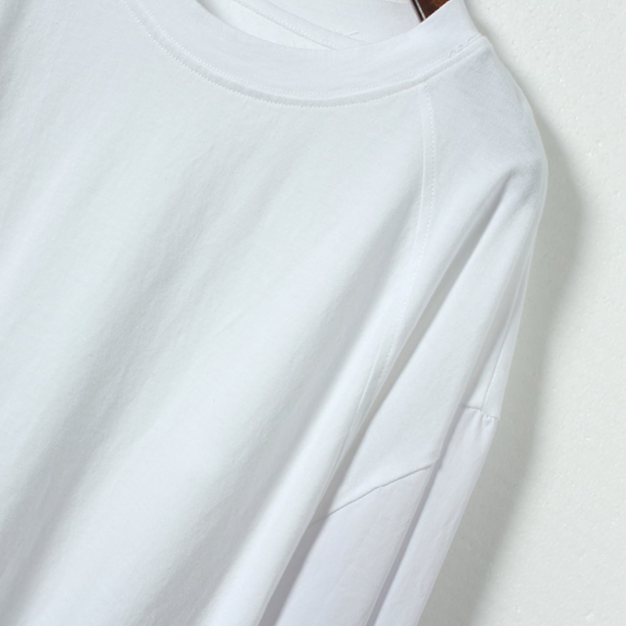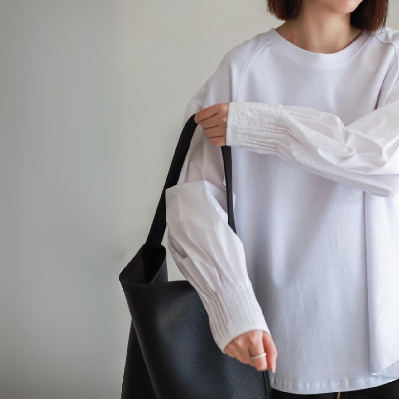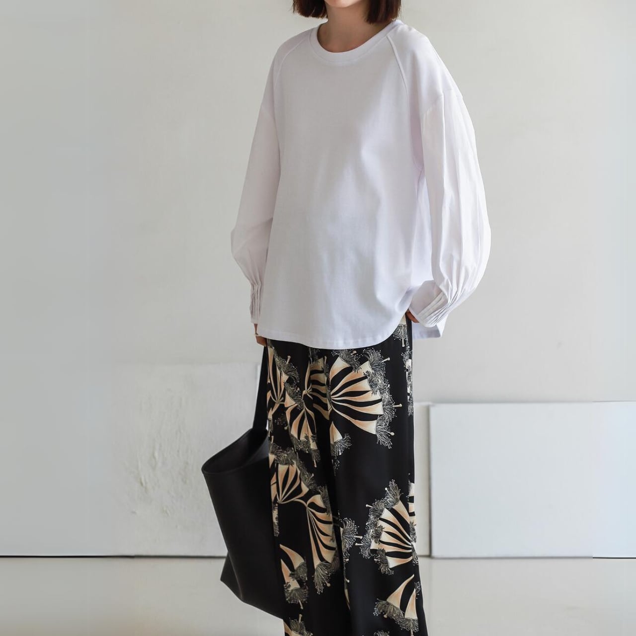 "プリーツ入りのランタンスリーブがオシャレな、ゆったりシルエットのロングTシャツ。シンプルで着回し力抜群のアイテムです。柄物のボトムスを合わせても◎"