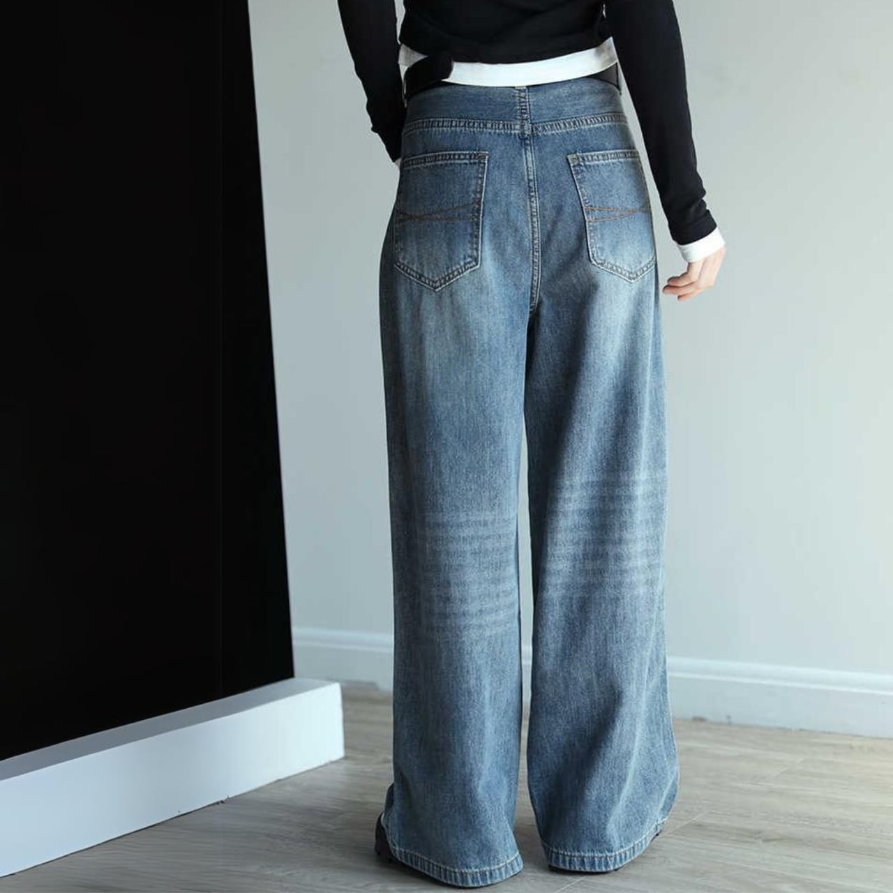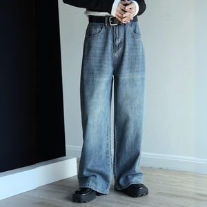"自然なウォッシュド加工がオシャレな、ゆったりシルエットのデニムパンツ。カジュアルになりすぎず落ち着いた印象にしてくれるので、大人女性にもおすすめです。"
