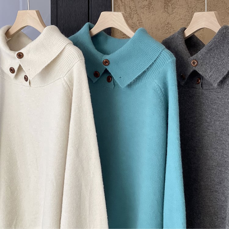 オープンカラーとタートルネック、2つのデザインを楽しめるハイゲージニット。