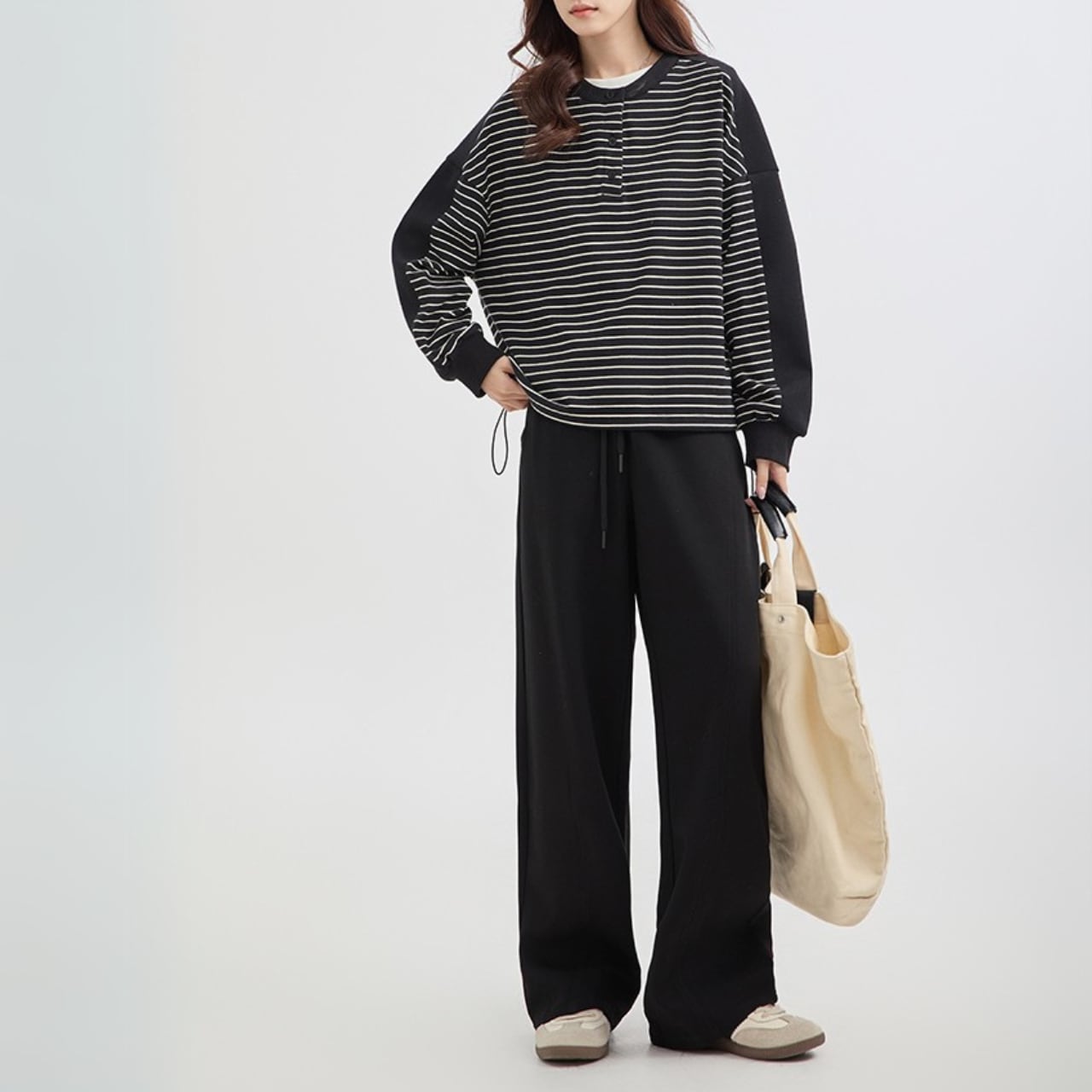 “ブラック×ホワイトのシックな2色使いがオシャレな、長袖のプルオーバートップス。ハーフボタンがアクセントになっていて、上品な印象をプラスしてくれます。顔周りが明るい印象になるので、白Tシャツとのレイヤードもおすすめ!”