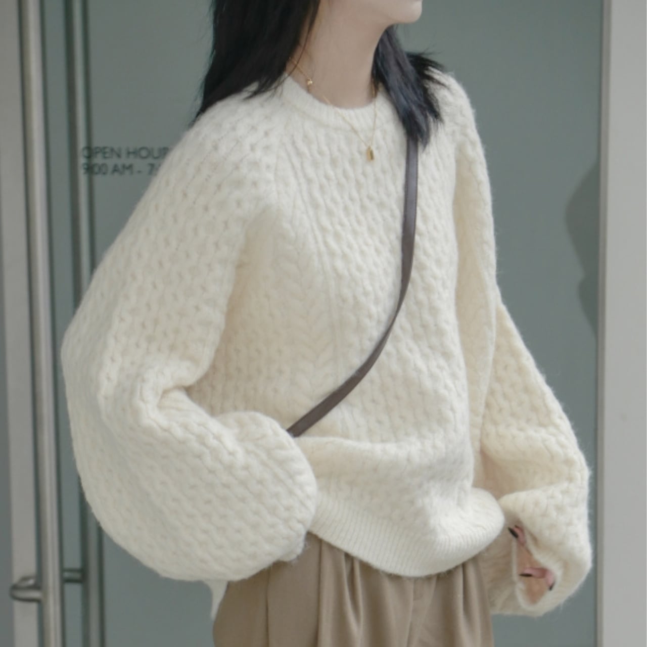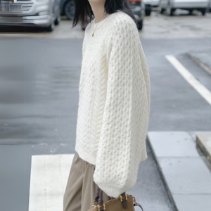 ワッフルのように見える編み目模様が魅力的なラウンドネックニット。