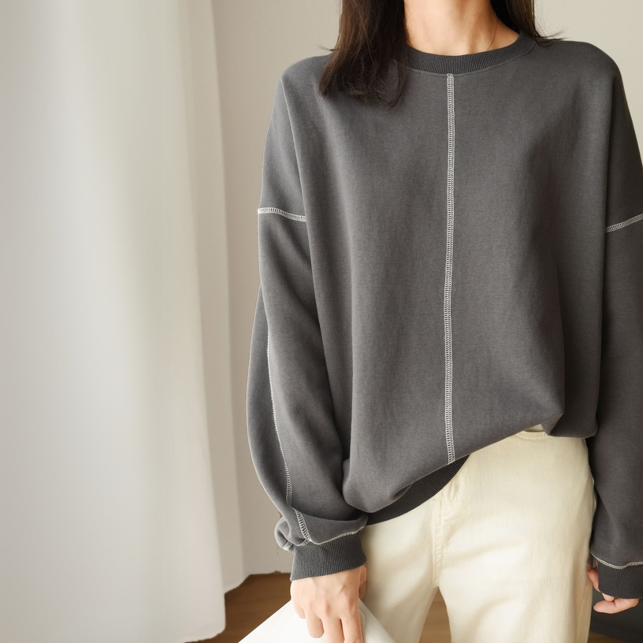 “ゆったりとしたシルエット&ステッチデザインが特徴的なラウンドネックプルオーバー。シンプルで着心地が良く、リラックスしたい時にぴったりの1枚です。今季注目を集めているチェック柄のボトムスとも相性抜群◎ロングネックレスを合わせてもオシャレです。”